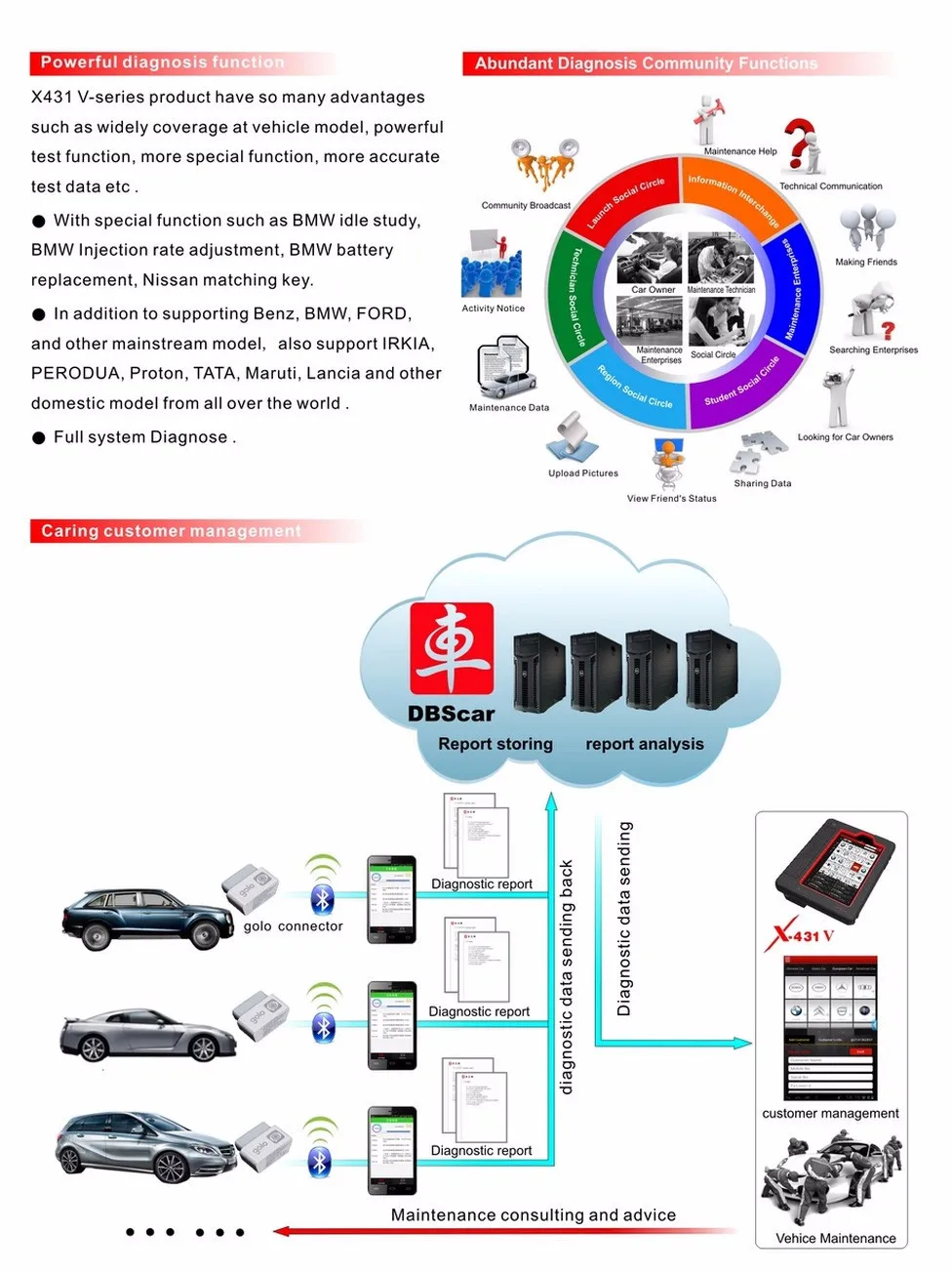 X431 V является новым выпуском диагностического инструмента с помощью технологии launch. В состав которого входят X-431 V pad Компьютер, защитный рукав, DBScar диагностический разъем и много OBD1 к OBD2 коннектора. Он поддерживает связь с вашим автомобилем с помощью DBSCAR connect с bluetooth, он читает автомобиль DTC и делает диагностику функцией X431 Pro Pad Компьютер, она обеспечивает полную модель автомобиля серии X431 и полную системную диагностику, это может заменить X431 Diagun III или X431 IV. тем временем, воспользовавшись мобильным интернетом, Она включает в себя больше приложений и услуг, таких как создание базы данных по обслуживанию и библиотека дел, предоставление информации о мгновенном обслуживании, создании общественного и частного социального круга и т. д. В результате он строит широкую диагностическую систему транспортного средства, который помогает вам обмениваться знаниями по обслуживанию транспортных средств в режиме онлайн, Обмена опытом обслуживания в Интернете и предоставить автомобиль связанные сервисную поддержку онлайн. Это будет еще одна революция, вызванная запуском в диагностическую индустрию автомобиля.