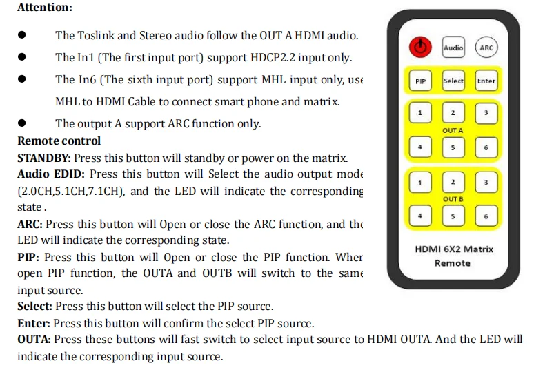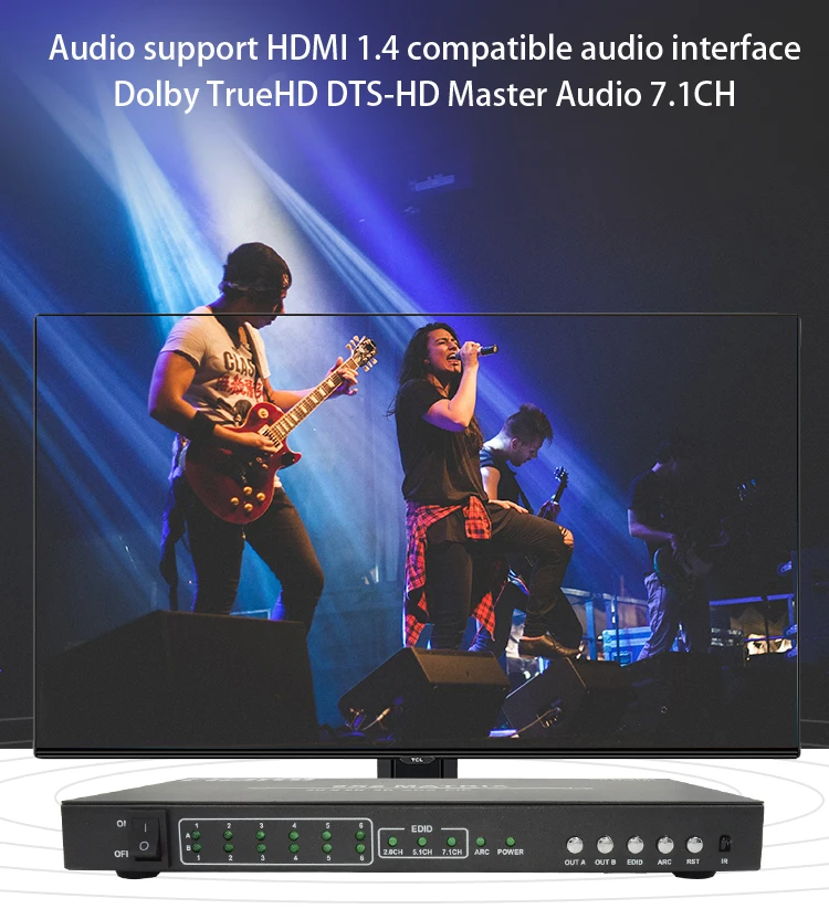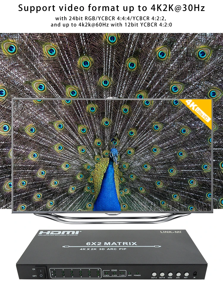 LINK-MI LM-MX62-ARC HDMI Matrix 6 × 2 с поддержкой 4K × 2K, что позволяет передавать и отображать сигнал HDMI из любого из шести источников одновременно на любом из двух подключенных дисплеев HDMI. Он поддерживает 3D, 3 Гбит/с, 12-разрядный глубокий Цвет, высокой четкости без потери качества звука и другие особенности определяется HDMI техническими характеристиками. Управление сценариями источника/раковины может быть легко управляется через кнопки на панели, ИК-пульт дистанционного управления.