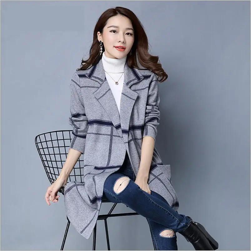 2017 новое поступление женский длинный свитер кардиганы плед Повседневный Сезон весна-осень, свитеры длинное пальто плюс размер 3XL кардиганы Femme KC13