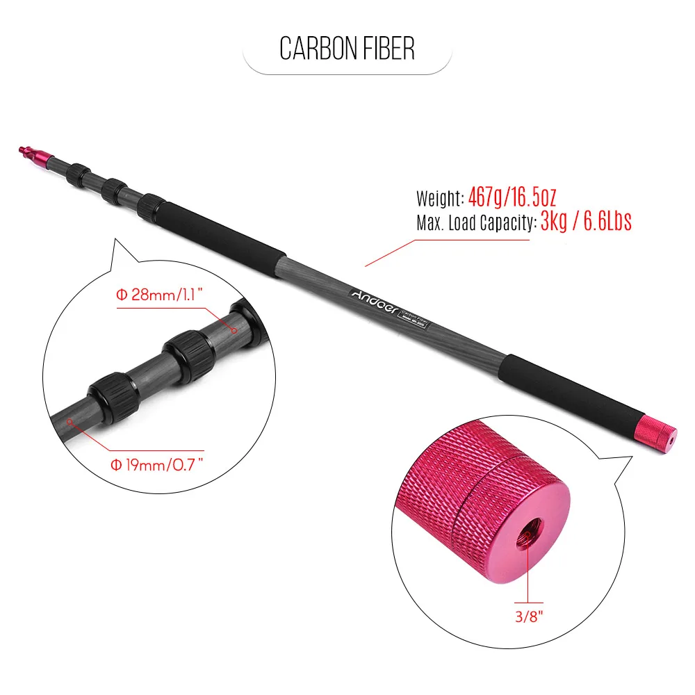 Andoer MK-3000 3 м/9,8 футов держатель микрофона изготовлен из твердого и легкого углеродного волокна. Стандартный винт 3/8 "подходит для большинства микрофонов и аксессуаров. Быстросъемный замок позволяет регулировать длину за считанные секунды. Провод можно спрятать во внутренней части полюса. Отверстие для винта в нижней части 3/8 дюйма позволяет установить его на мини-штатив.
