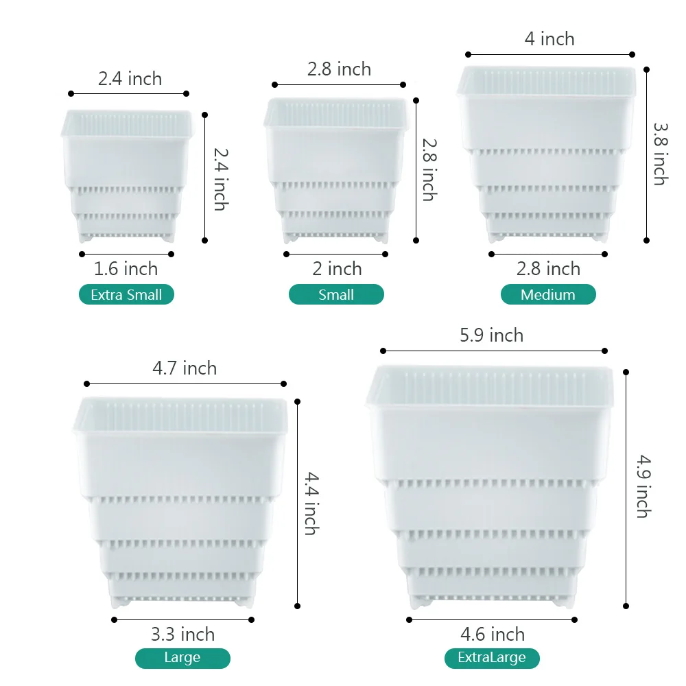 Размер Дополнительный маленький: Внутренний диаметр: 6 см (2,4 дюйма); Внешний диаметр: 6,4 см (2,5 дюйма); Нижний диаметр: 4,2 см (1,7 дюйма); Высота: 6 см (2,4 дюйма) Маленький: Внутренний диаметр: 7 см (2,8 дюйма); Внешний диаметр: 7,4 см (2,9 дюйма); Нижний диаметр: 5 см (2 дюйма); Высота: 7 см (2,8 дюйма) Средний: Внутренний диаметр: 10 см (4 дюйма); Внешний диаметр: 10,5 см (4,1 дюйма); Нижний диаметр: 7,1 см (2,8 дюйма); Высота: 9,6 см (3,8 дюйма) Большой: Внутренний диаметр: 12 см (4,7 дюйма); Внешний диаметр: 12,7 см (5 дюймов); Нижний диаметр: 8,3 см (3,3 дюйма); Высота: 11,1 см (4,4 дюйма) Экстра большой: Внутренний диаметр: 15 см (5,9 дюйма); Внешний диаметр: 15,6 см (6,1 дюйма); Нижний диаметр: 11,6 см (4,6 дюйма); Высота: 12,5 см (4,9 дюйма) В комплект входит упаковка 6 шт горшки Примечание: Цветочный горшок не содержит сочных растений или декоративных фигурок.
