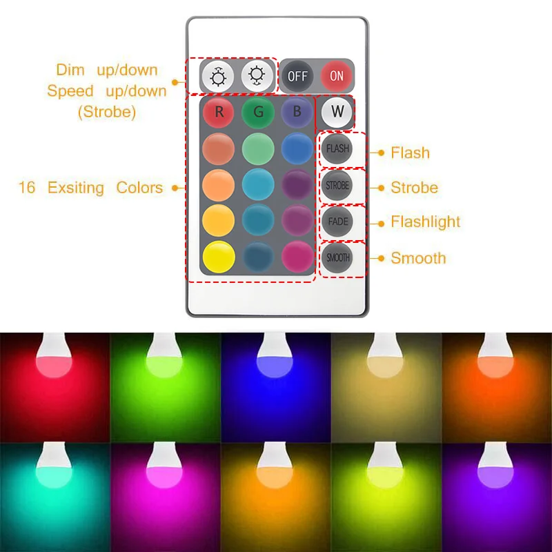 1 шт. x RGB/RGBW/RGBWW светодиодный светильник1 шт. ИК-пульт дистанционного управления с 24 кнопками(Аккумулятор CR2025 не входит в комплект)Характеристики:Название: светодиодный RGB светильникОснование: E27Цвета: 16 цветовВход: AC85V-265VПотребление: 5 Вт/10 Вт/15 ВтМатериал: алюминиевый сплавСветодиодный срок службы: > 50000 часовПодходит для освещения и украшения дома/вечерние/и т. Д.Батарея дистанционного управления: 1 х CR2025 кнопочный аккумулятор (Батарея в комплект не входит)Размер: 5 Вт 50*91 мм/10 Вт 60*112 мм/15 Вт 65*127 мм24 клавиши ИК-пульта дистанционного управления:Вверх: яркость вверх/Длительное нажатие для быстрого миганияВниз: яркость вниз/Длительное нажатие для медленного миганияВыключение: выключение питанияВКЛ.: Включение питанияR: изменение цвета на красныйG: изменение цвета на зеленыйB: изменение цвета на синийW: красный зеленый синий микс в белыйВспышка: автоматическое изменение цвета, быстрый переходСтробоскоп: автоматическое изменение цвета, медленная съемкаВыцветание: автоматическое изменение цвета, быстрый оттенокГладкая: Авто-изменение цвета, медленное затенениеДругие кнопки без букв: для разных цветовОсобенности:1. Очень низкое тепловыделение, отсутствие УФ-или ИК-излучения2. Энергосберегающие и экологически чистые, низкое потребление, высокая яркость3. Это крутой светодиодный RGB светильник, который поставляется с пультом дистанционного управления, может менять 16 цветов4. Светодиодный светильник, меняющий цвет, с беспроводным пультом дистанционного управления для использования в любом стандартном сокете накаливания5. Его можно использовать в одном статическом (фиксированном) цвете или просто нажмите на пульт дистанционного управления, чтобы произвести один из четырех эффектов изменения цвета6. Волшебное освещение способно излучать белый, красный, зеленый, синий, плюс 12 дополнительных ярких цветов7. Он имеет вспышку, стробоскоп, выцветание и плавный режим для максимального управления вечерние светильникПрименение:Дом, гостиницы, клубы, торговые центры, архитектурные декоративные, изысканная атмосфера, освещение магазинов, конференц-зал, завод, светильник, задний светильник, скрытый светильник, буквенный светильник