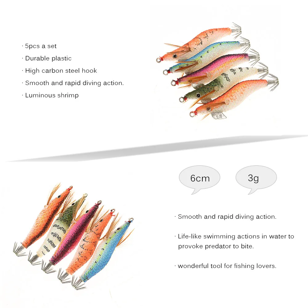 5 шт./компл. набор рыболовных приманок рыболовные приманки для креветок набор светящихся пластиковых искусственных кальмаров рыболовные приманки с крючками из углеродистой стали
