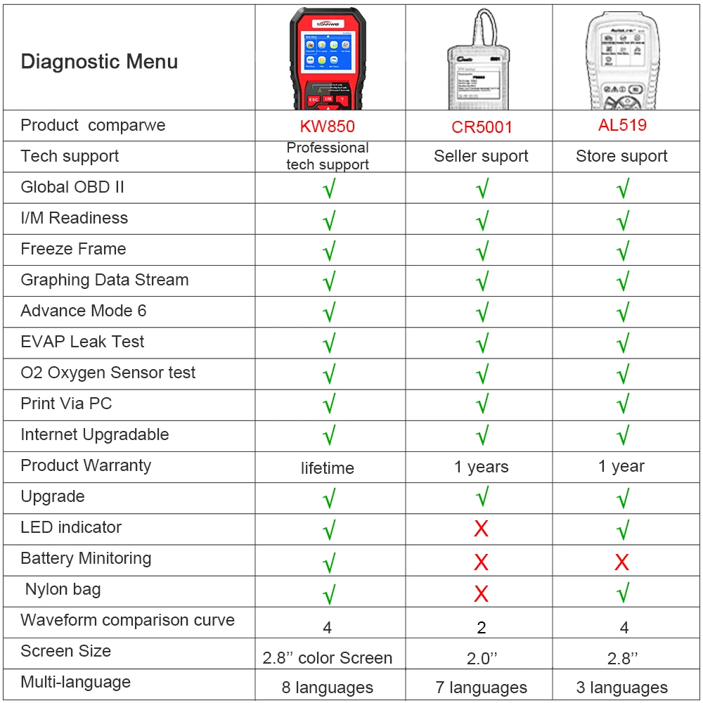 Порт KW850 sup s и дизельные и бензиновые транспортные средства, если автомобиль совместим со стандартными протоколами OBDII, с диагностическим портом OBDII 16pins.