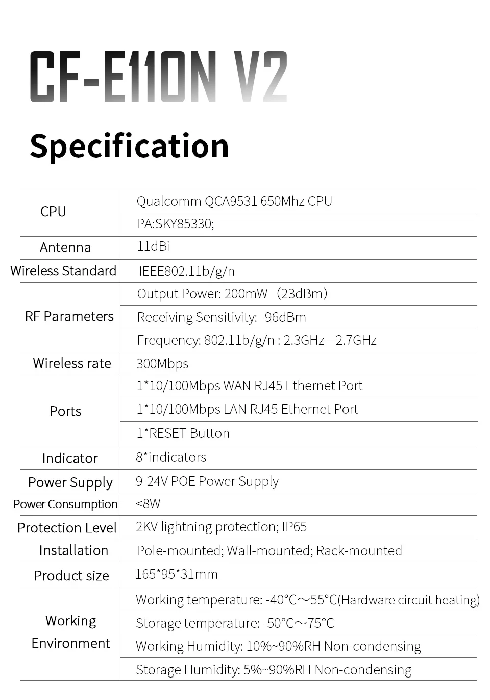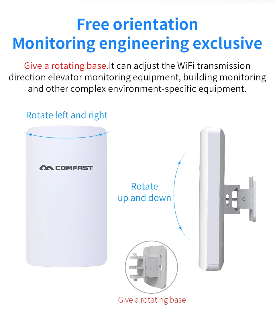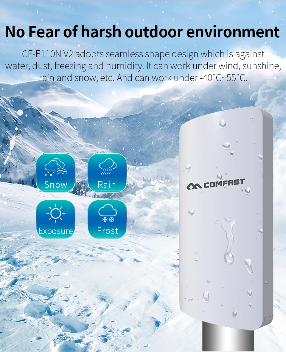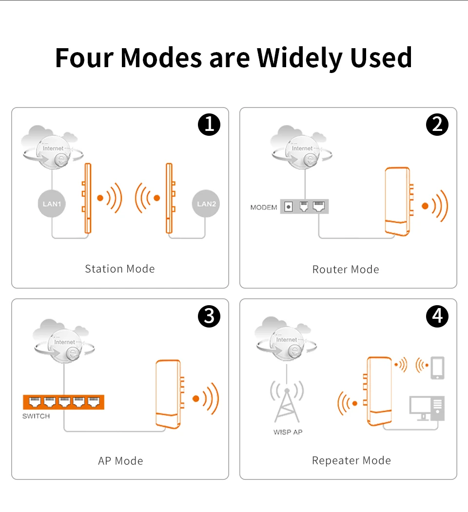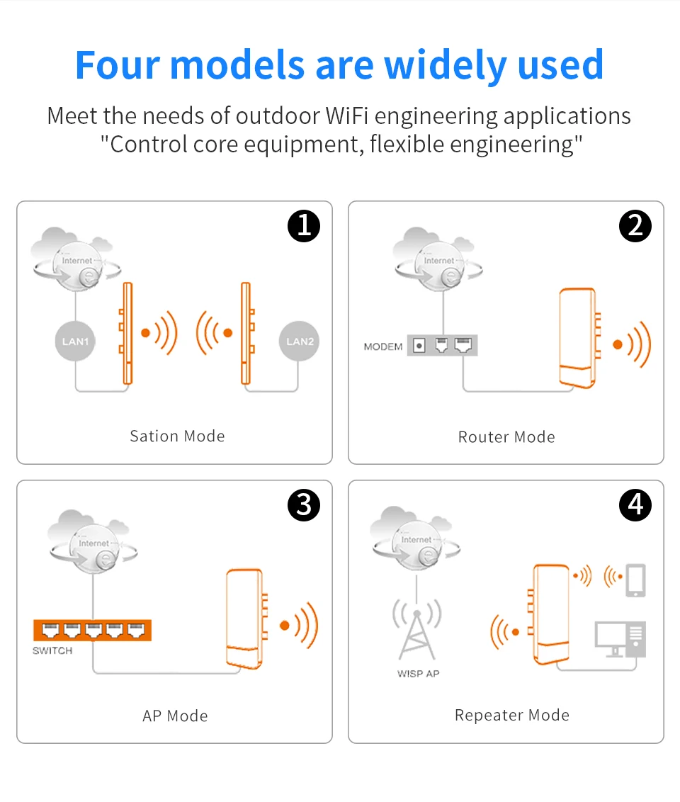 Он поддерживает беспроводную точку доступа, ретранслятор, роутер, режим работы беспроводного моста, эффективное решение для PTP, PTMP и наружного покрытия Wi-Fi большого радиуса действия.