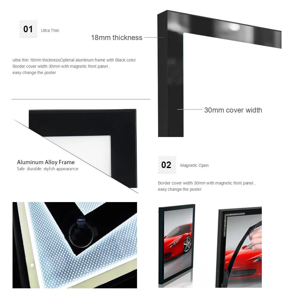 Открытый метод:Открытая присоска для передней магнитной передней акриловой панели; Легко изменить плакат,