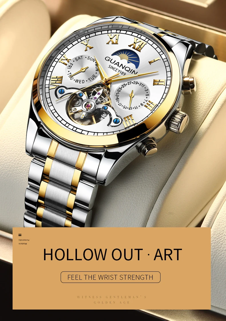 -Торговая марка: GUANQIN -Особенности: водонепроницаемые /ударостойкие -Материал корпуса: нержавеющая сталь -Длина часов: 22 см -Диаметр циферблата: 39 мм -Высота циферблата: 13 см -Ширина ремешка: 20 мм Пакет включает в себя: 1 X часы GUANQIN Коробка-1 шт. 1 X Зеркало ткань 1 х гарантийный талон 1 инструмент для замены ремешка