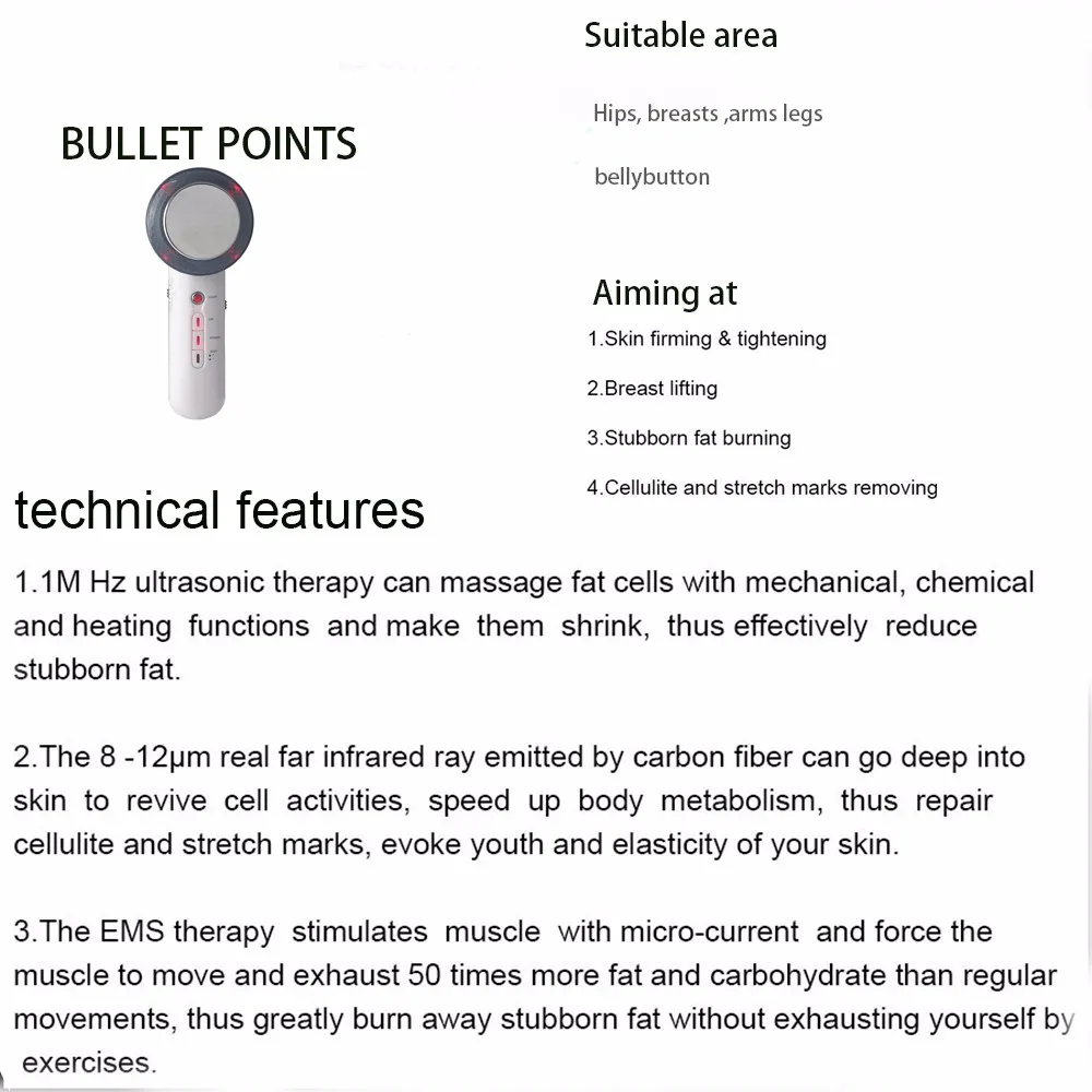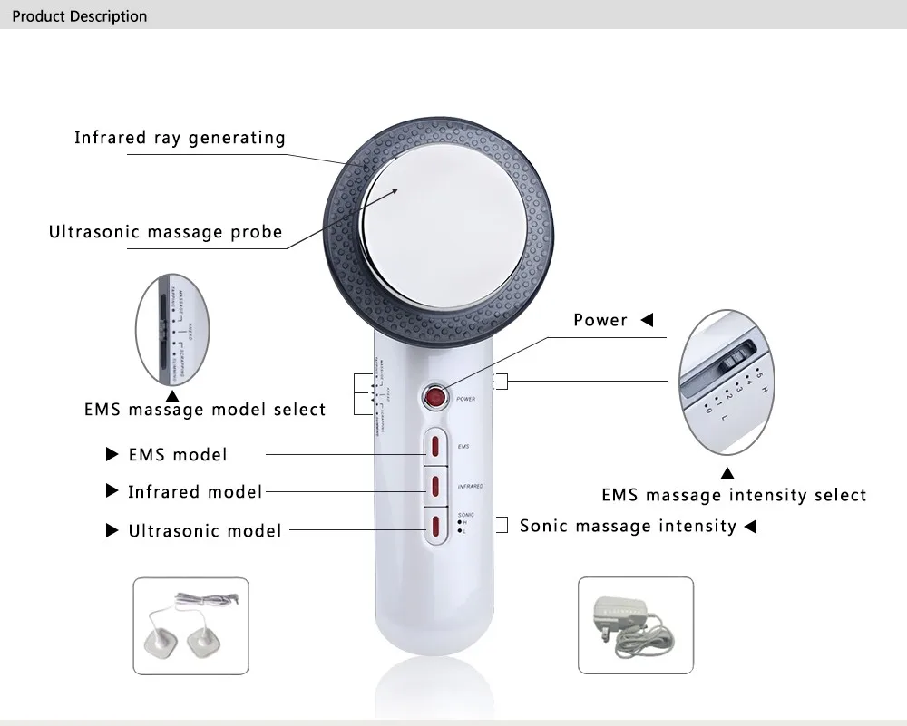 Описание продуктаСпецифика:Особенности:Тип:Не перезаряжаемыйМатериал: корпусАБС-пластикМатериал: зондНержавеющая стальЦвет:БелыйРазмер зонда:57 ммРазмер:190*80*60 ммВес:220 гУльтразвуковая частота:1 МГц ± 5%Выход регулируется:Низкий, высокийНастройка таймера:10 минут автоматического отключенияДлина волны инфракрасного излучения:8-12umВыходной Регулируемый режим:Пять режимов массажа emsВыход регулируется:Пять ems сила массажаВходная мощность адаптера:100 В-240 В переменного токаВыходная мощность адаптера:15 В постоянного тока, 800 мА