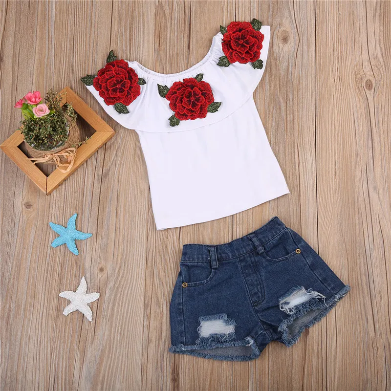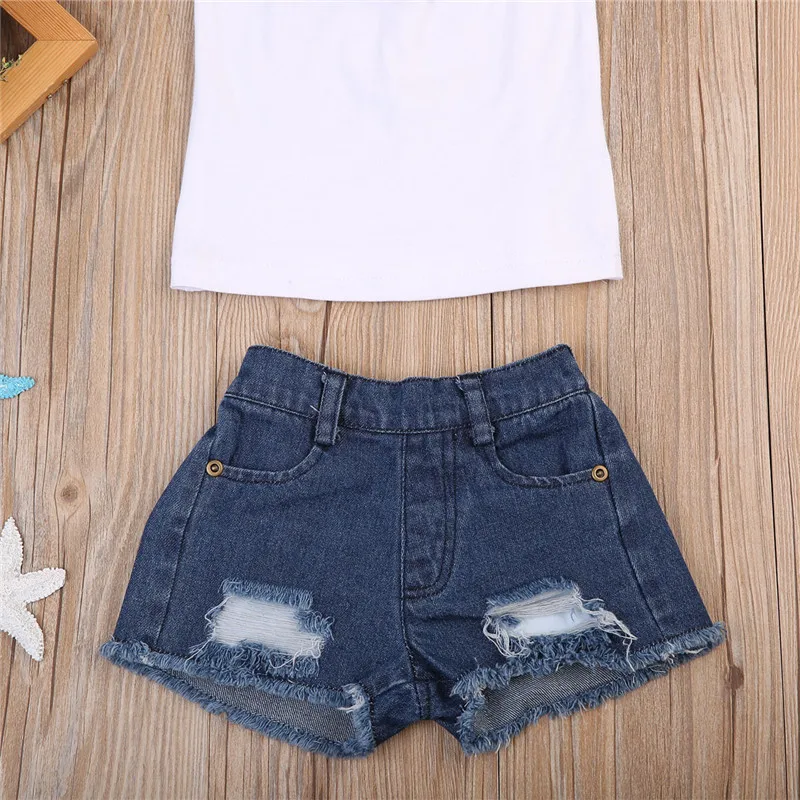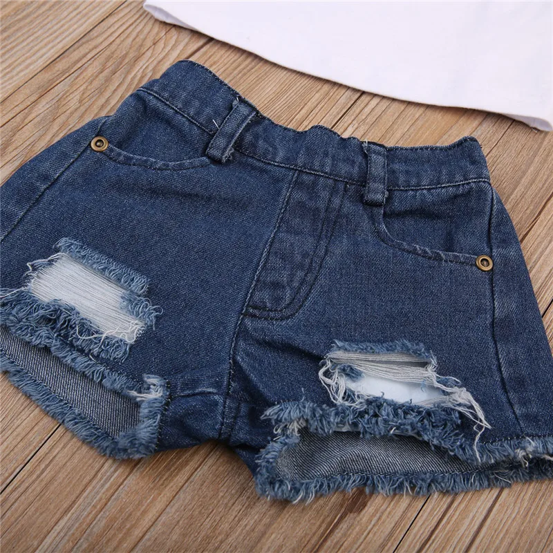 Новейшая модная одежда для маленьких девочек! Высокое качество и абсолютно новый 100% Основной цвет: как на картинке Новинка в моде Материал:Хлопок и денимОбратите внимание: если ваш ребенок пухленький, мы рекомендуем выбрать больший размер, спасибо.Пожалуйста, перед покупкой ознакомьтесь с фактическим ростом вашего ребенка и таблицей размеров. Спасибо. В комплект входит:1 Топ и 1 джинсовые шорты Таблица размеров: