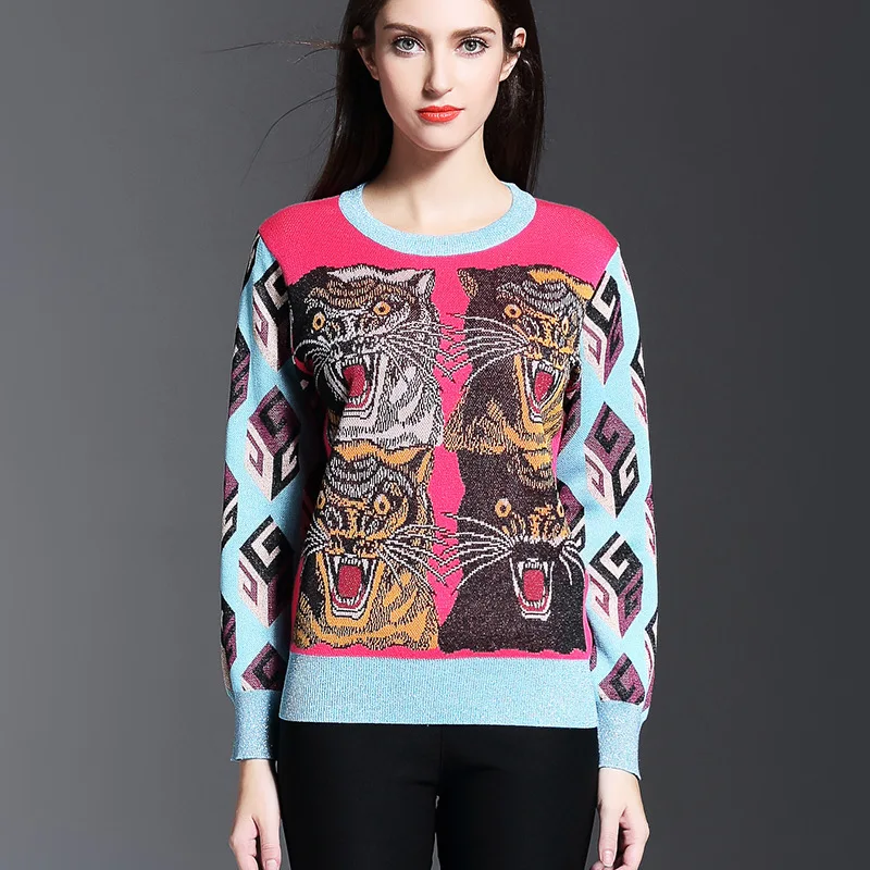 2017 Новый французский стиль Красочный трикотаж одна мораль Высокое качество голова тигра дизайн пуловеры женский трикотаж Свитера S-LНам $58.00 /Шт