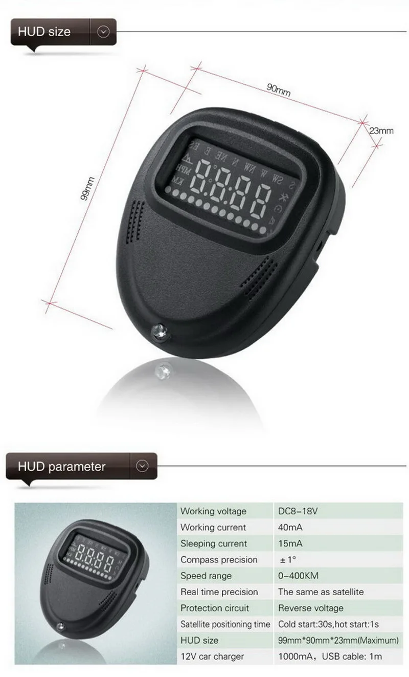 Спасибо за покупку нашего GPS HUD. Этот продукт предназначен для безопасности водителей, на высоких скоростях, особенно в высокоскоростном вождении в ночное время, чтобы избежать водителя, чтобы посмотреть на голову, чтобы смотреть на инструмент, и уменьшить автомобильную аварию. HUD в чрезвычайно критический момент отражает его Деликатный уход. HUD может проецировать важную информацию, отображаемую инструментом (например, скорость) на лобовое стекло, это может не только помочь определить скорость неопытного новичка, чтобы контролировать свою скорость и избежать многих ограничений скорости дороги из-за нарушения скорости. Что еще более важно, это позволяет водителю мгновенно считывать номер в большом видении и всегда заставлять водителей следить за дорогой в ясном уме.