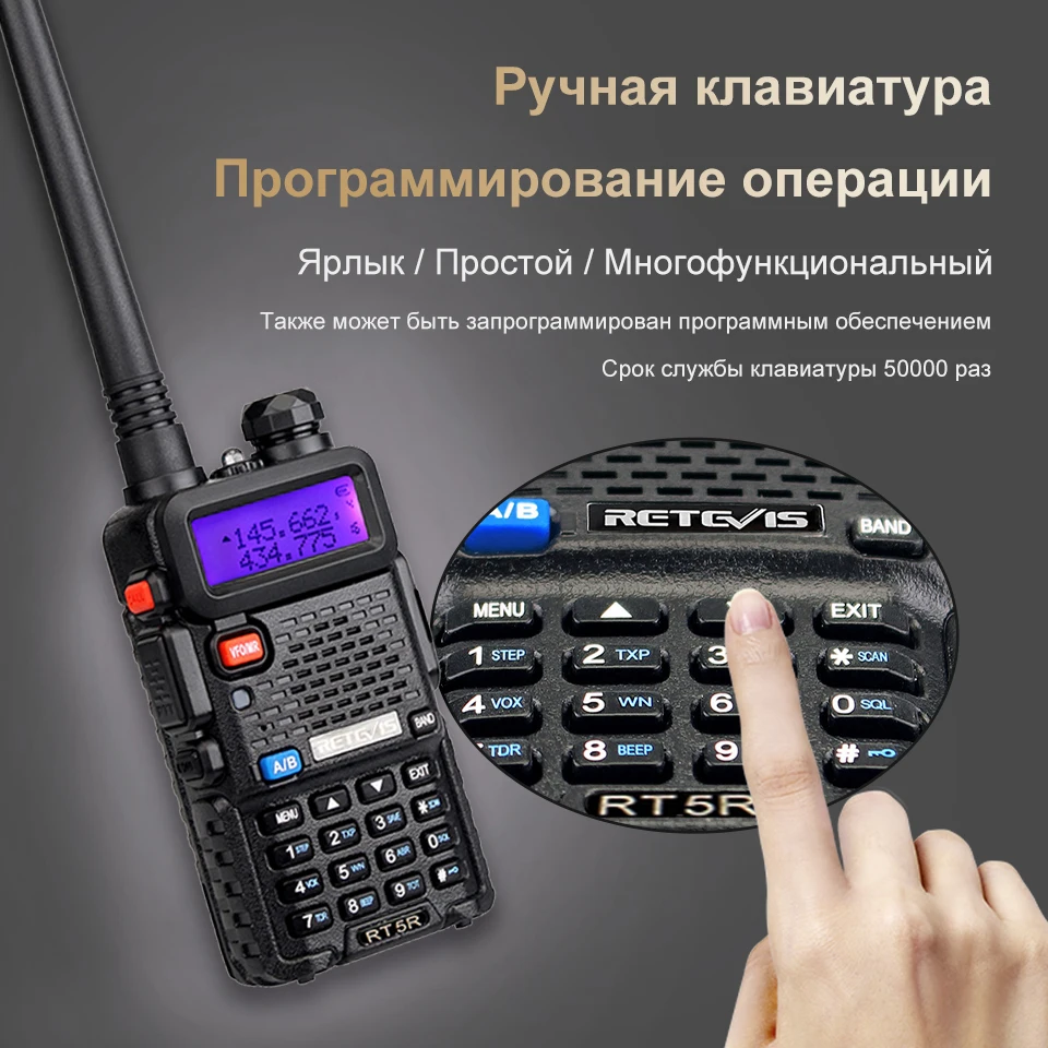1. Рация RT5R имеет двухдиапазонный УФ-диапазон, диапазон частот:144–148 МГц и 420–450 МГц (версия для США), 144–146 МГц и 430–440 МГц (версия для ЕС), почти все конфигурации могут быть реализованы с помощью рации, вы можно запрограммировать самостоятельно без какого-либо программного обеспечения или кабеля.