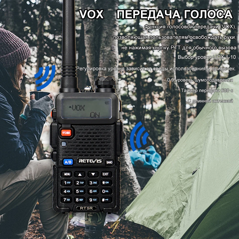 3.Функция VOX: двусторонняя радиостанция RT5R имеет функцию VOX, нажмите MENU и кнопку 4, чтобы активировать или отрегулировать уровень VOX, от 1 до 10. Для программирования VOX не требуется никакого программного обеспечения или кабеля.