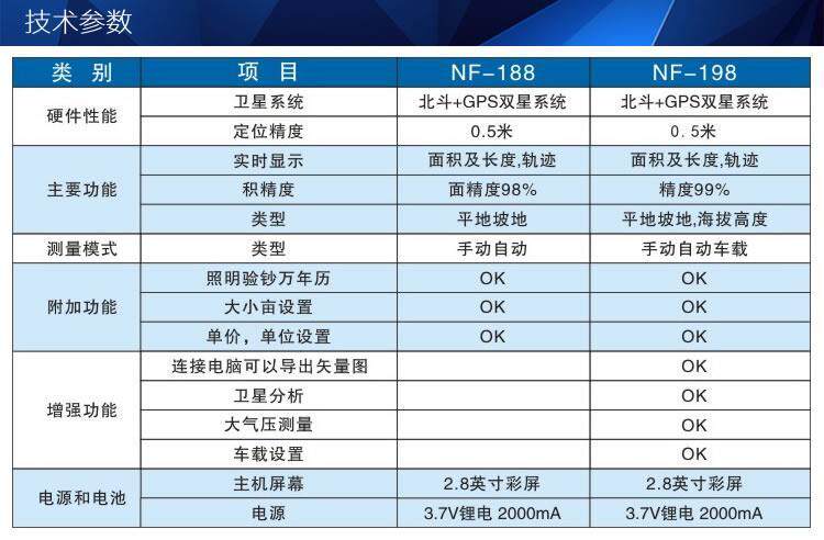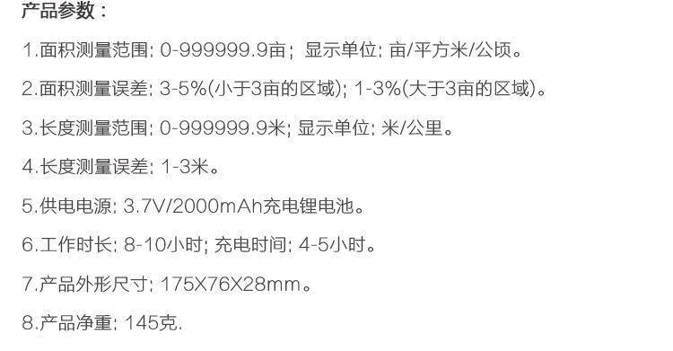 NF-198Параметры продукта: 1. Диапазон измерения площади: 0 ~ 999999,9 mu; Единица отображения: mu/м²/ha. 2. Погрешность измерения площади: 3 ~ 5% (площадь менее 3 акров); 1 ~ 3% (площадь больше 3 акров). 3. Диапазон измерения длины: 0 ~ 999999,9 метров; Единица отображения: метров/км. 4. Погрешность измерения длины: 1-3 метра. 5. Мощность питания: 3,7 V/2000mAh перезаряжаемая литиевая батарея. 6. Время работы: 8 ~ 10 часов; Время зарядки: 4 ~ 5 часов. 7. Размеры изделия: 175 × 76 × 28 мм. 8. Вес нетто продукта: 145 г. NF-198Технические параметры Производительность оборудования: Beidou + GPS двойной-звезда системы, точность позиционирования: 0,5 метров Основные функции: отображение в реальном времени площади и длины, дорожки, плоского наклона, измерения высоты, Точность: 99% Режим измерения: ручная автоматическая, транспортное средство Дополнительные функции: освещение, проверка банкнот, вечный календарь; Большие и маленькие настройки mu; Цена единицы, настройка единицы Улучшение: подключение к компьютеру для экспорта векторной графики, спутникового анализа, измерения атмосферного давления, настройки транспортного средства Мощность и аккумулятора: 2,8-дюймовый цветной экран, 3,7 V литиевая батарея 2000mA NF-198Особенности: 2,8-дюймовый большой цветной экран дисплея, 320X240 точечная матрица, более четким и интуитивно понятным. Он может измерять площадь и периметр участков любой формы (включая горы и склоны). Он может измерить длину земли (т. Е. Длину или расстояние) любых двух точек или любого пути. После завершения измерения, он может отображать измеренное значение, графическую траекторию и автоматически рассчитать цену. Методы измерения делятся на: автоматические и ручные. Он может сохранять и записывать 99 частей истории и графических треков. Вы можете прочитать записи истории в любое время. Возможно установить коэффициент конверсии цены единицы площади, цену единицы измерения и квадратный метр, а также установить Автоматические и ручные методы измерения. Он интегрирует вспомогательные функции, такие как обнаружение банкнот, освещение ночного видения и подсветка. Случайная конфигурация 2 шт 3,7 V/2000VAH перезаряжаемая литиевая батарея. Каждая батарея может работать непрерывно в течение 8-10 часов. Значительно экономит затраты пользователя на использование, чтобы обеспечить потребность в длительных часах работы.