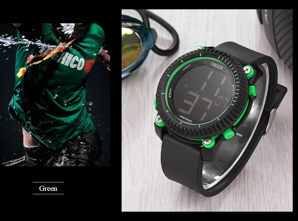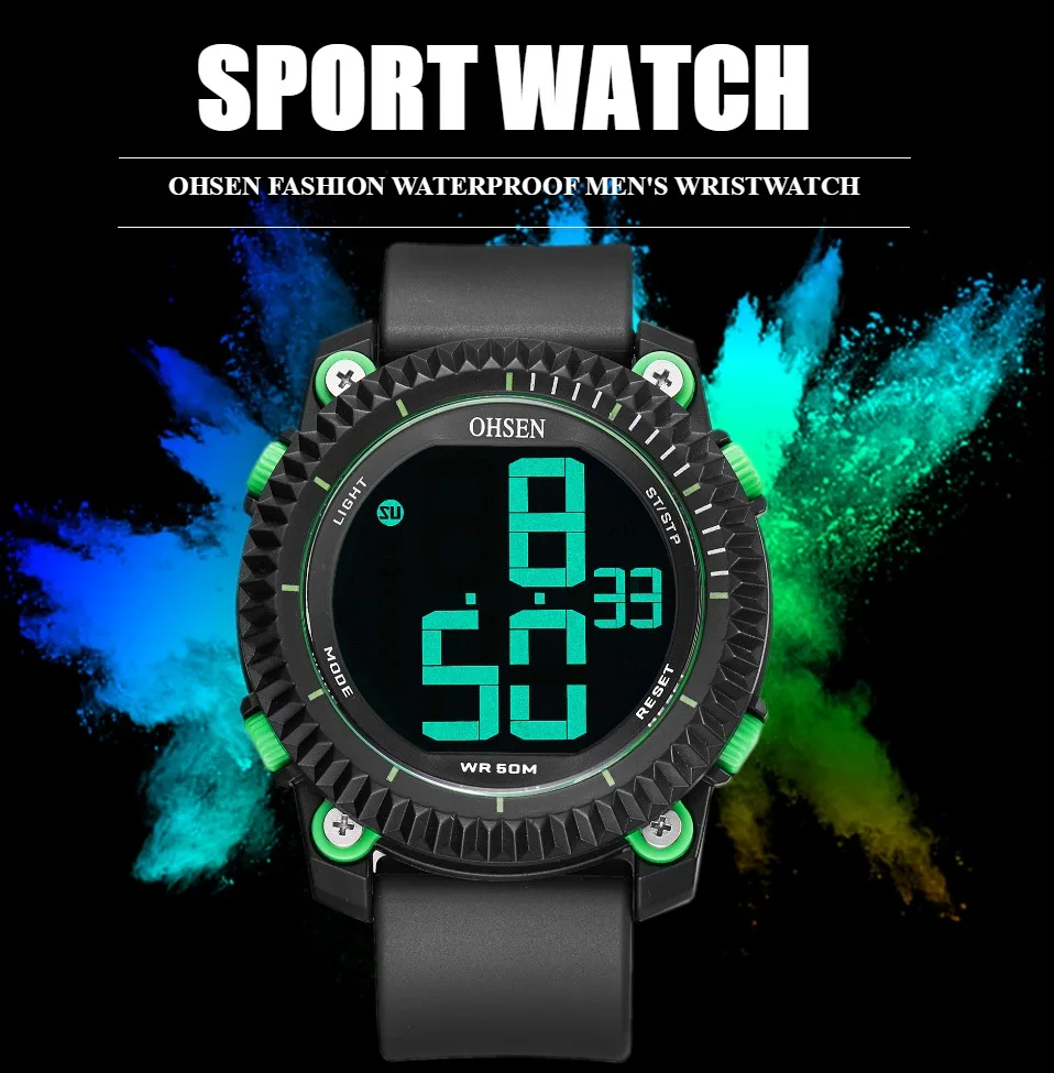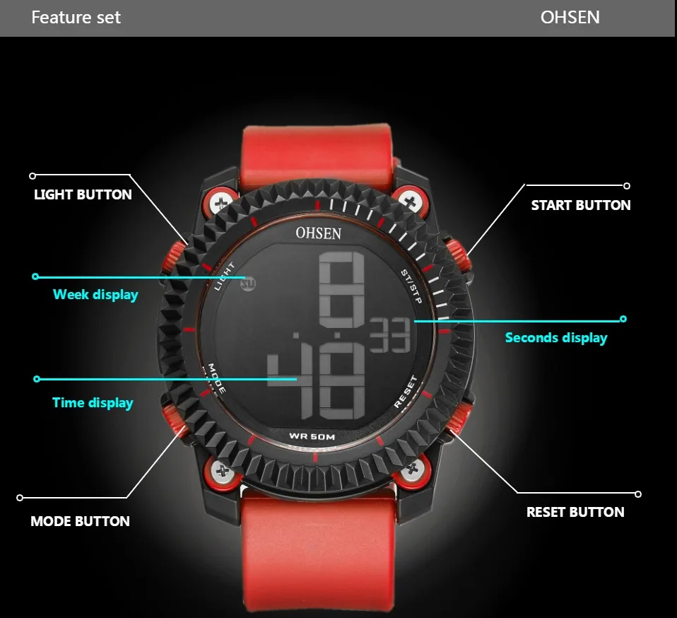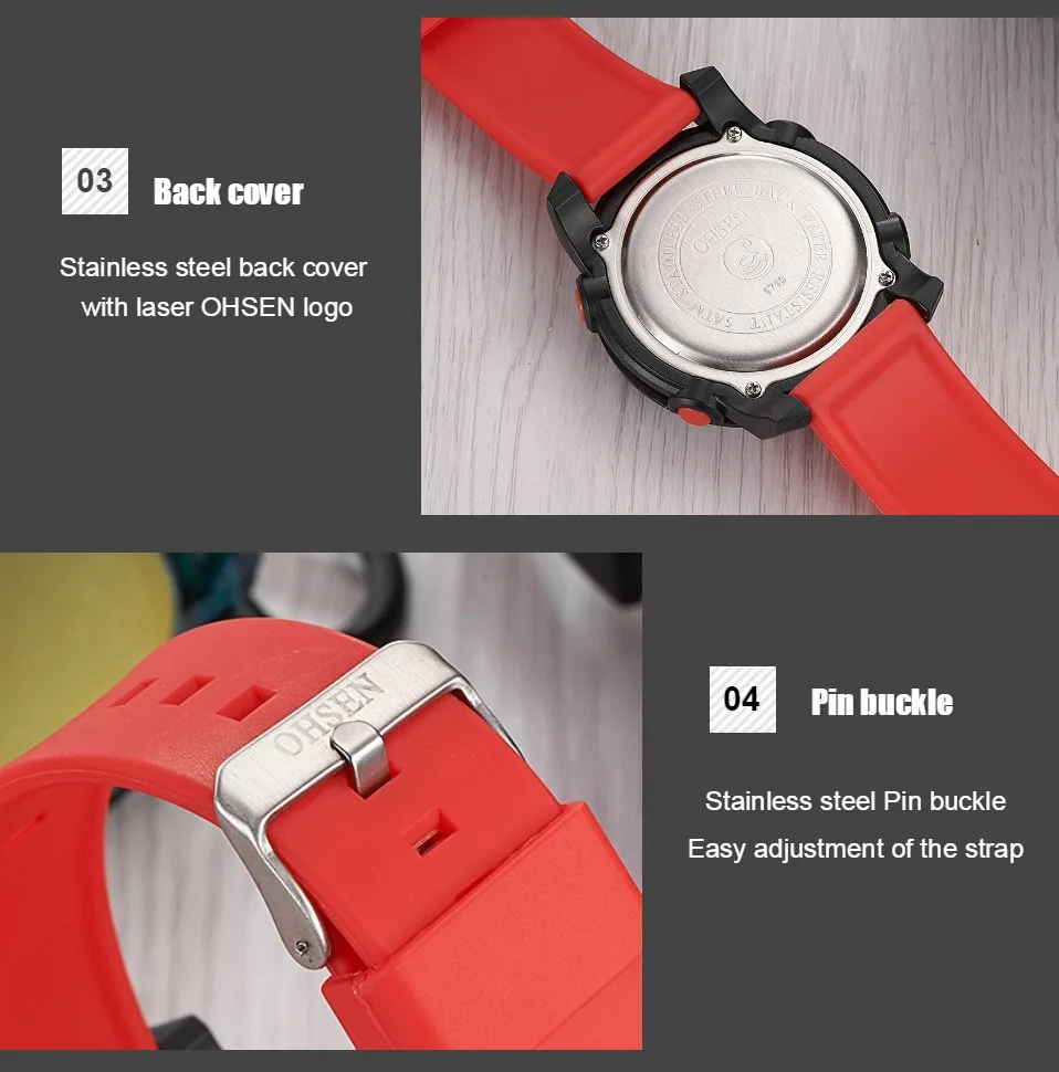 Japan Maxell кнопочный элемент, более длительное время использования Задняя крышка из нержавеющей стали с лазерным логотипом OHSEN Резиновый ремешок хорошего качества, более удобный Пряжка из нержавеющей стали