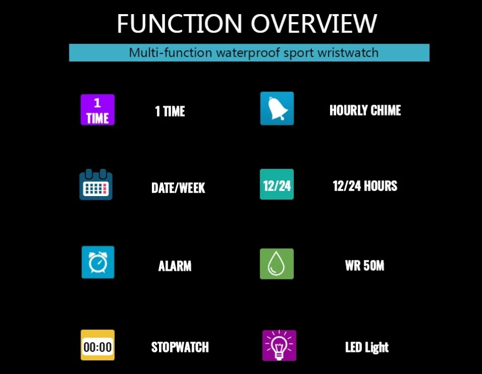 Цифровой: часы, минуты, секунды, вечера, месяц, дата, день Формат 12/24 часов Будильник и функция ежечасного звонка Специальная конструкция с хронограф (секундомер) при температуре не выше 0,01 второй шаг Водонепроницаемость до 50 м (не нажимайте кнопку в воде) Дополнительный ЖК-светильник для отображения времени в темноте