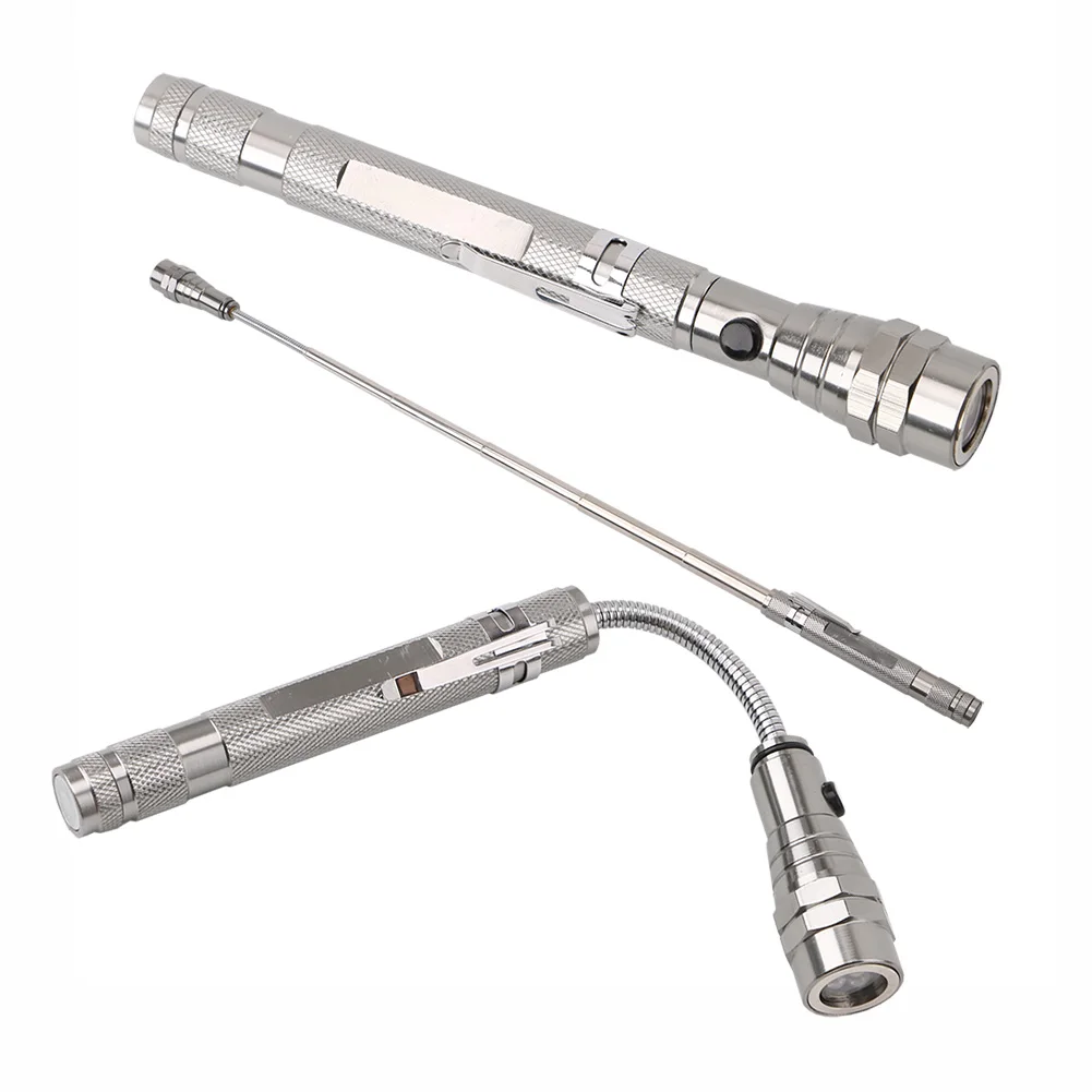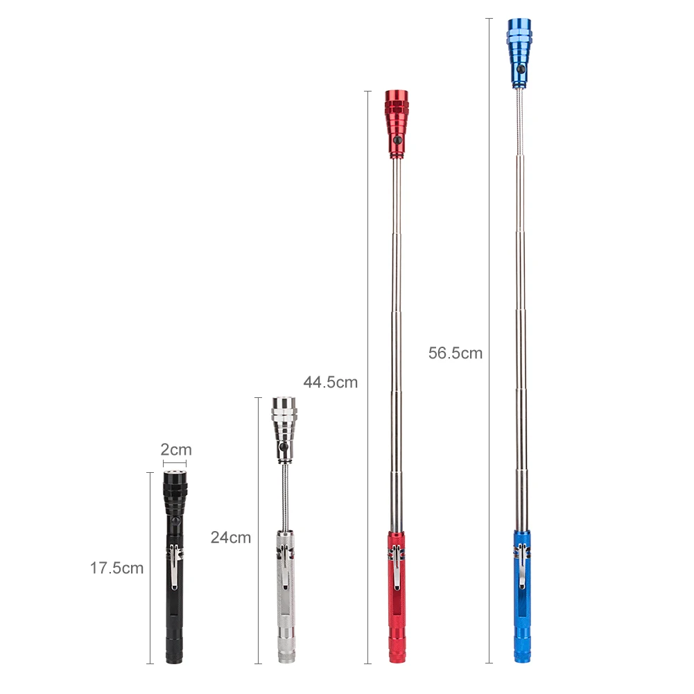 Sanyi гибкий магнитный фонарь для инструментов Особенности: Для сбора металлических деталей, аппаратных инструментов, гаек и болтов и т. д. Магнитная головка с светодиодный подсветкой, больше подходит для снятия маленького зазора в темноте Поставляется с зажимом, прост в использовании. Масштабируемый, растягивающийся размер около 56,5 см Питание от 4 * кнопочного аккумулятора (входит в комплект); Примечание: Перед использованием удалите набивку кнопки. Описание: Лампы: 3 * Светодиодный Цвет: черный, красный, синий, серебристый Нерастянутом Размер: 17,5 см Размер стрейч: 56,5 см Диаметр головки: 2 см Материал: металл В комплект входит: 1 Мини светодиодный фонарик