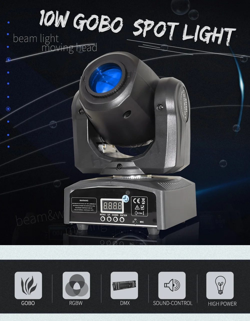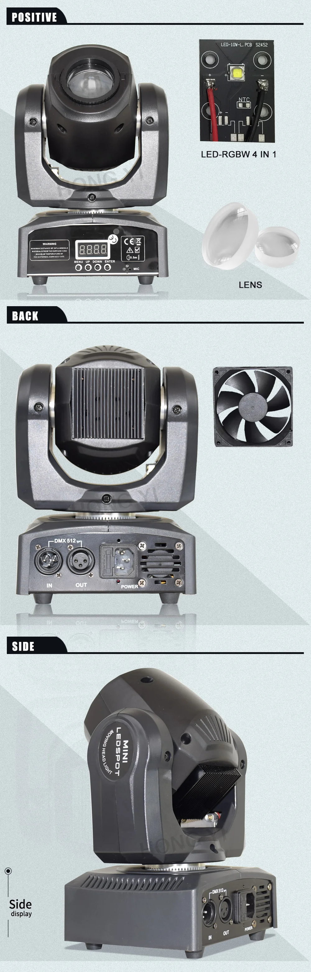 Технические характеристики: Напряжение: AC100-240V 50-60 Гц Источник света: 1 шт. 10 Вт Cree led (Яркость равна традиционному 30 Вт светильник с подвижной головкой) Общая мощность: 40 Вт Режим воспроизведения: Автоматический запуск, звуковая активация, DMX512, master-slave Встроенный стандарт программ, сцена, ТВ, архитектурный и театральный режим Канал управления: 8/11 каналов Горизонтальный угол сканирования: 540 градусов, скорость можно контролировать Вертикальный угол сканирования: 270 градусов, скорость можно контролировать Цветовое колесо: 7 цветов, эффект радуги Колесо Gobo: 7 gobo + open, gobo flow effect gobo shake Диммер: 0-100% Линейный диммер Фокус: ручной фокус Демонстрационная плата: цифровой трубчатый дисплей svreeBody Размер: 170x145x275мм N W: 2. 8 кг