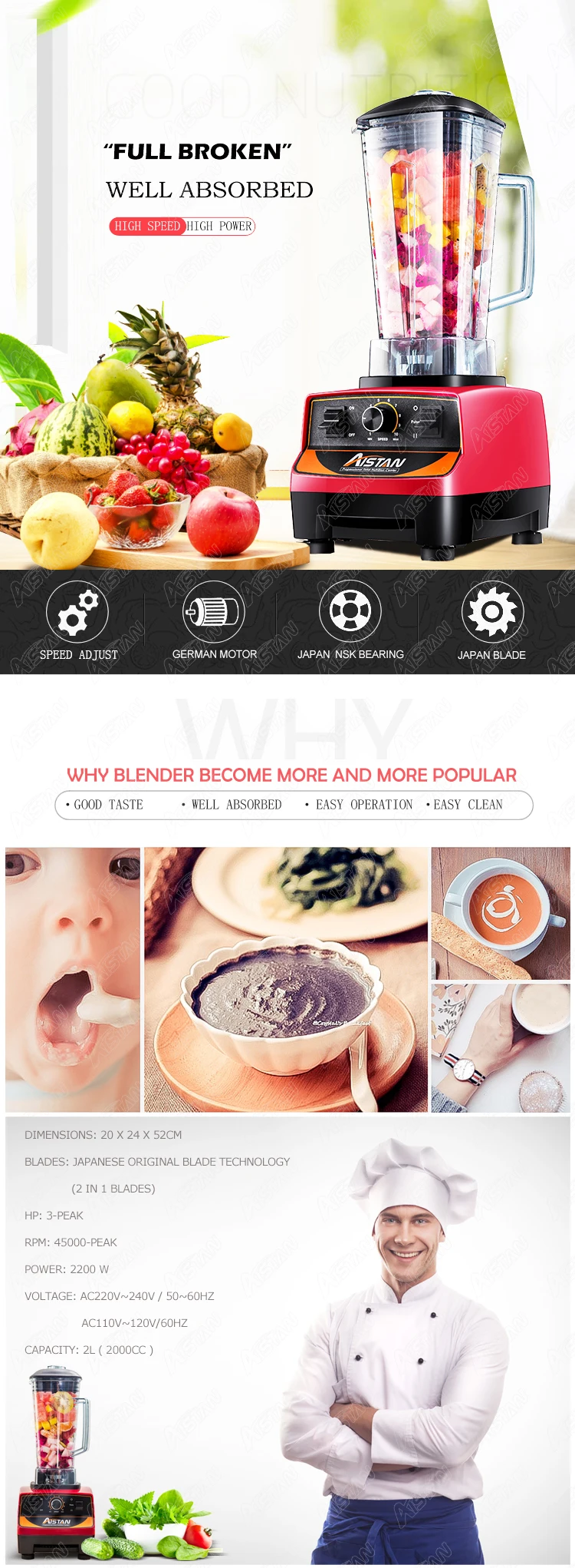 Размеры: 200x240x520 мм Лезвия: японская оригинальная технология лезвия HP: 3-peak Скорость: 45000rpm-peak Мощность: 2200 Вт (максимальная нагрузка) Напряжение: 110 В или 220 В Емкость: 2л (2000CC)