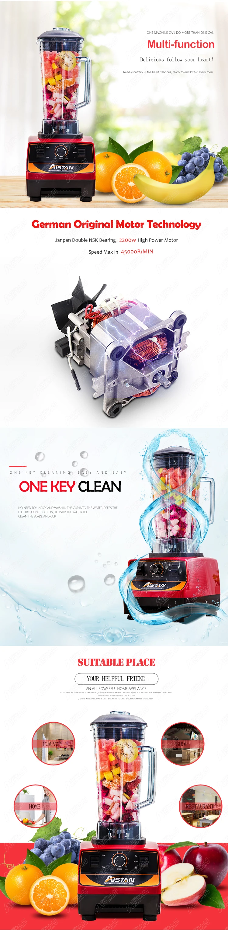 1. Закаленные лезвия из нержавеющей стали-японская оригинальная технология лезвия, будучи твердым и острым с более сильной прочностью и долгим сроком службы 2. Металлическая Соединительная система-вместо пластикового соединения, которое быстро изнашивается, использует металлическую соединительную систему для подключения контейнера к основанию двигателя-позволяет лучше сочетать и продлить срок службы. 3. 3 л.с. мотор-Немецкая оригинальная моторная технология. 100% Медь интегрированная конструкция двигателя, 45000 скорости (об/мин) Убедитесь, что блендер может работать стабильно, низкий уровень шума, длительный срок службы, супер мощный. Уникальный дизайн может охладить двигатель быстро и действителен 4. Профессиональная система подшипников-двойной японский импортный подшипник NSK, срок службы которого в 5 раз больше, чем у обычных 5. Защита от перегрузки по току-автоматическое отключение при перегрузке по току или высокой температуре, защита блендера