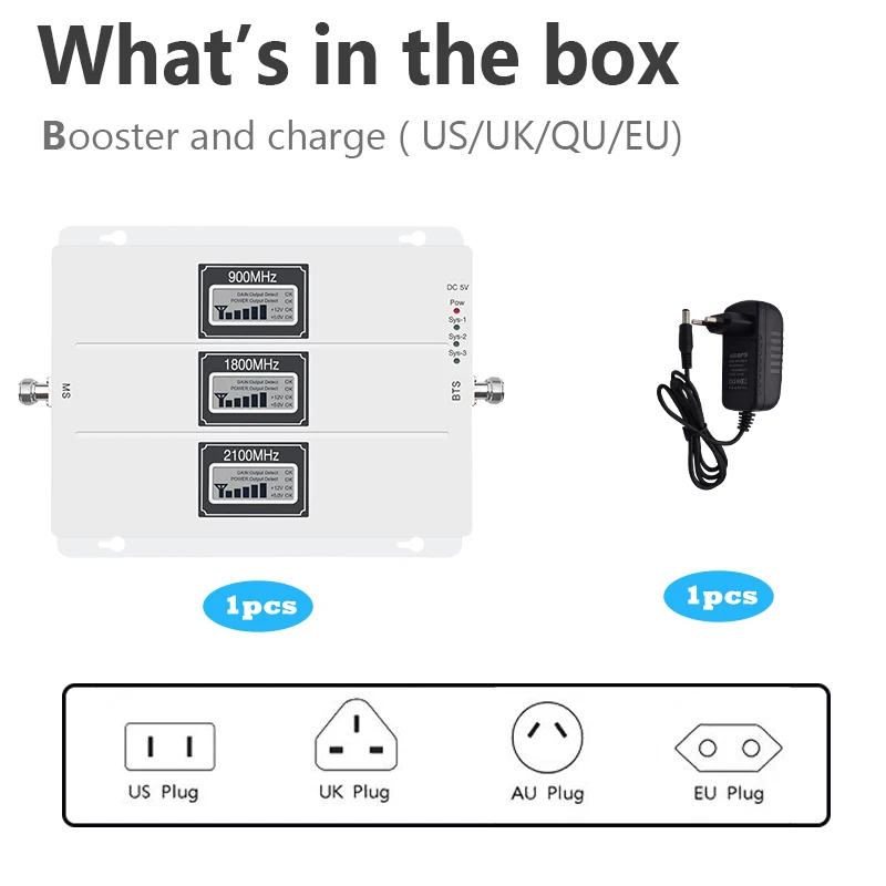 1. Трехдиапазонный усилитель для GSM900mhz + WCDMA2100mhz + DCS1800mhz 2. Зарядное устройство с вилкой европейского стандарта (адаптер AU/UK/US поставляется с товаром в соответствии с вашим адресом доставки)