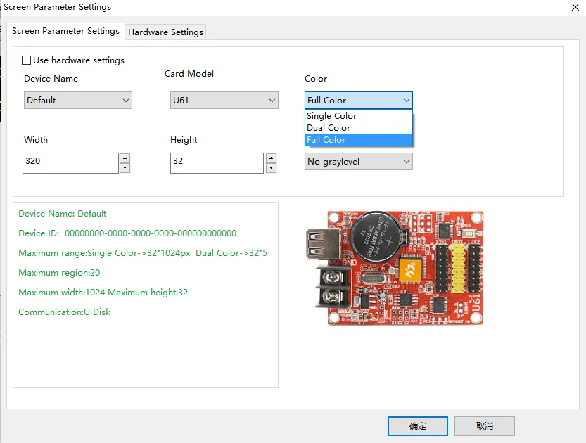 Задайте Параметры экрана, выберите серый уровень, RGB, один двойной цветной модуль