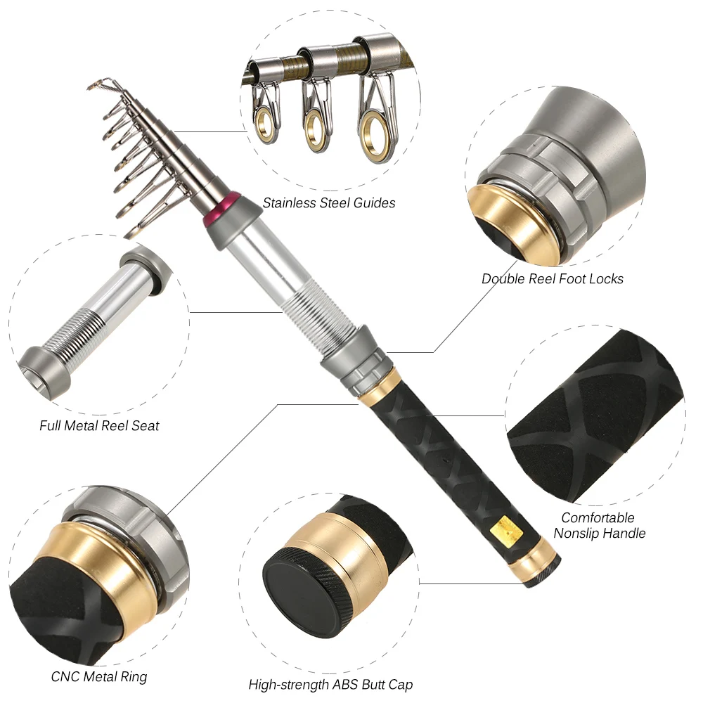 Полный комплект для рыбалки: телескопическая морская удочка, спиннинговая Рыболовная катушка, сумка для рыбалки, леска 100 м, различные приманки, рыболовные крючки, некоторые необходимые рыболовные аксессуары.