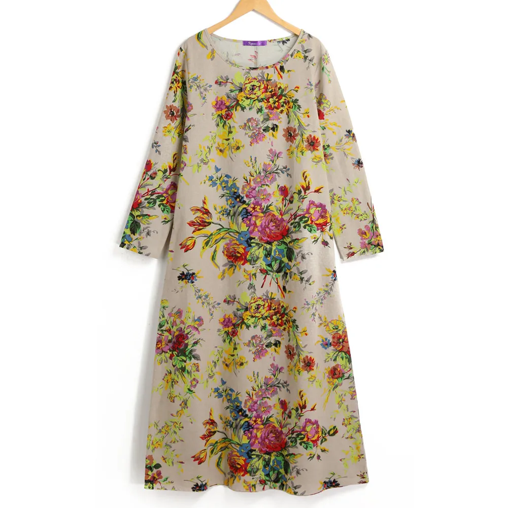 XXXL 5XL размера плюс, винтажное платье, женское длинное платье макси с цветочным принтом, женское платье с длинными рукавами, карманами и круглым вырезом, хлопковое льняное свободное платье