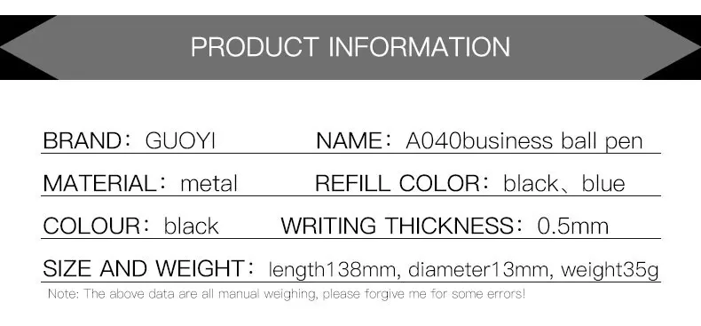 Бренды: Guoyi Номер товара: A040 Материал изделия: металл Длина изделия: 13,74 см Вес одной ручки: 35 г Вес подарочного набора: 92 г Цвет изделия: черный 0,5 мм пера Цвет письма: синий и черный