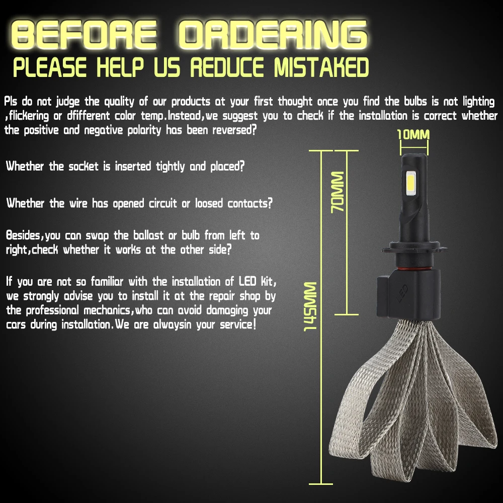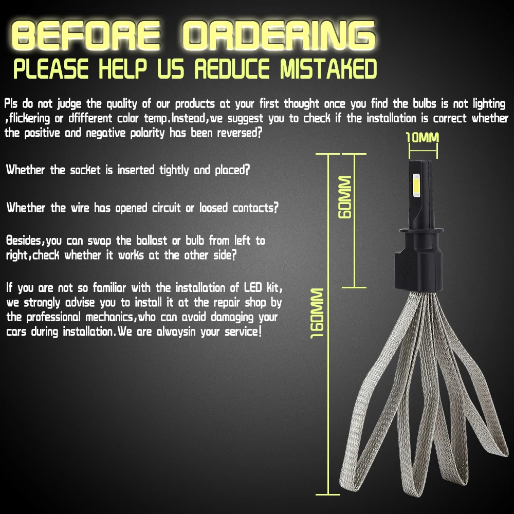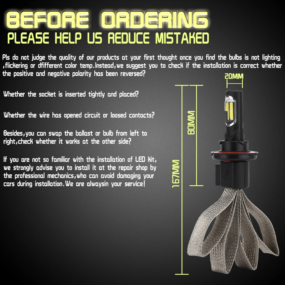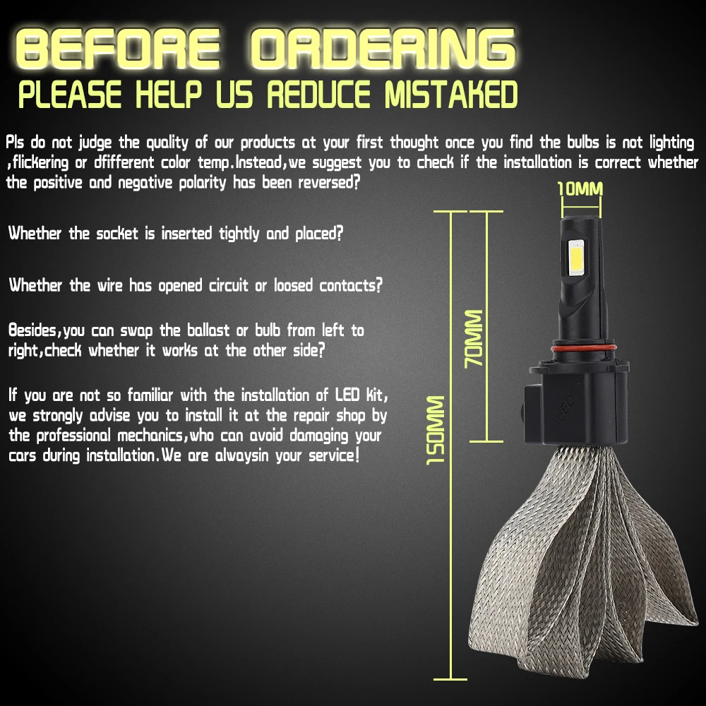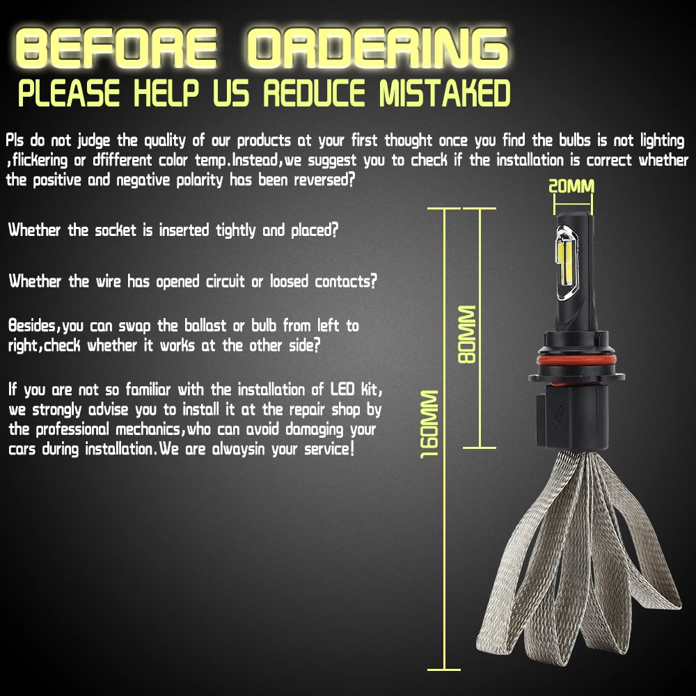 Однолучевая Модель: H1, H3, H7, H8/H9/H11, 9005/HB3, 9006/HB4 880/881 Би ксенон балка Модель: H4/9003/HB2 H13 9004 9007 Пожалуйста, выберите правильную модель, которая вам нужна Если вы не уверены в установке, пожалуйста, свяжитесь с нашей службой поддержки клиентов, мы можем помочь вам Состояние: 100% новый Материал: 6063 алюминий Модель источника света: COB Лампы с технологией: светодиодные лампы Мощность (Вт): 80 Вт Люмен (лм): 8000 лм/комплект Рабочее напряжение: 12-36 В постоянного тока Угол луча: 270 градусов-Ближний свет, 360 градусов-Дальний свет Цветовая температура (K): 6000K Срок службы: более 50000 часов Рабочая температура: от-40 до + 80 по Цельсию Уровень водонепроницаемости: IP68 Комплектация: 1 пара светодиодных ламп