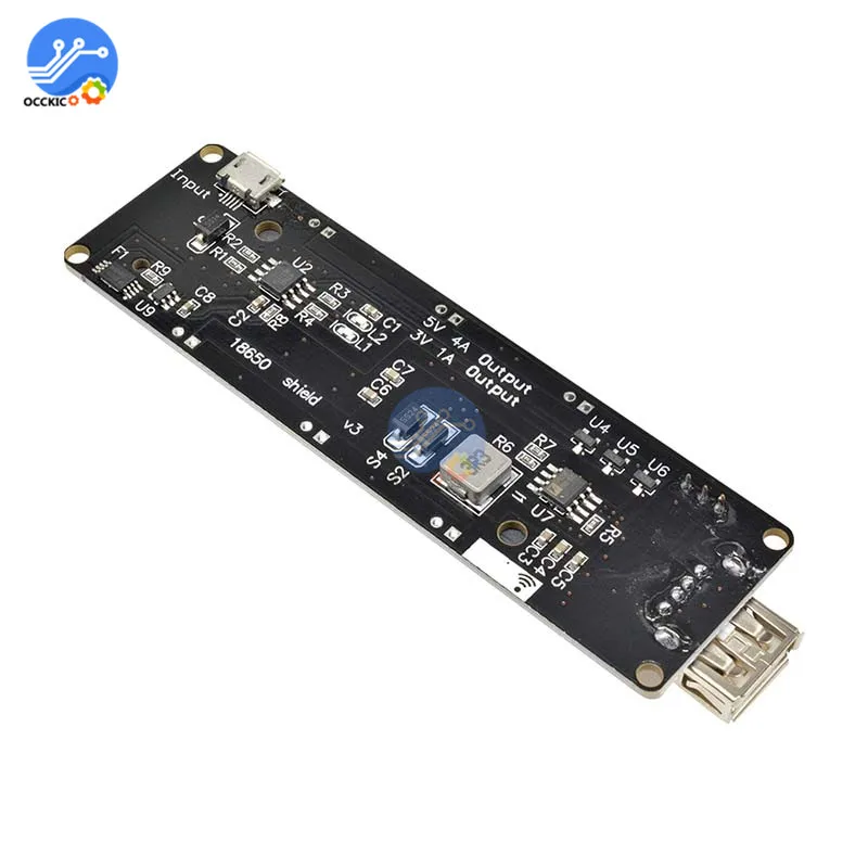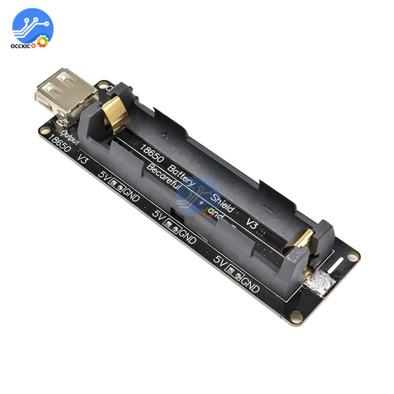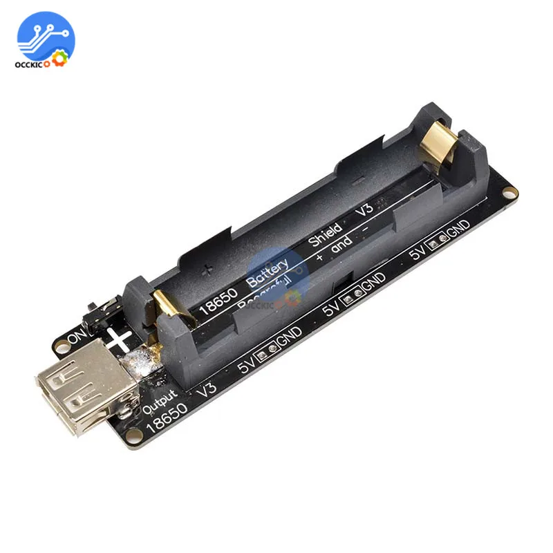 Защита аккумулятора (перезарядка или разрядка) Микро USB порт Вход Выход USB Type-A 0.5A сила тока при зарядке 1 переключатель управления выходом USB Входное напряжение 5 ~ 8 в 3V & 1A выход Выход 5 В и 2 А Светодиодный индикатор (зеленый означает полный, Красный означает зарядку) Выходной порт 3V x3 5V Выходной порт x3 Будьте осторожны с «+» и «-», вы должны следовать направлению «+»-» на печатной плате. Если вы поставите неправильное направление, чип зарядки будет уничтожен. Этот продукт не включает аккумулятор 18650 Посылка включает в себя: 1x18650 щит батареи V3 модуль (не включает аккумулятор 18650)