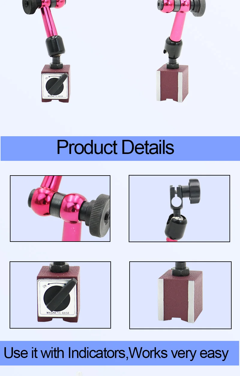 ★Описание: Магнитная подставка, которая использует переключаемый Постоянный магнит для удобного крепления на плоских железных или стальных поверхностях. Рукоятка может быть гидравлически заблокирована в любом положении с помощью ручки на вертикальном положении. Полезно для удержания индикаторов циферблата или индикаторов тестирования циферблата во время операций выравнивания. ★Особенности: 1. Работа с постоянным магнитом с контролем ВКЛ/ВЫКЛ. 2. V-образное Рифленое основание для надежного крепления на цилиндрических поверхностях. 3. Идеально подходит для удержания рычажных индикаторов при любой ориентации на станке для операций выравнивания. 4. Гибкие, прочные и точные поворотные соединения, можно регулировать любое направление и расположение 5. Мощное магнитное основание, с переключателем ВКЛ/ВЫКЛ для магнита 6. С высокой стабильностью, это будет вашим идеальным инструментом в измерении точного поля заготовки. 7. Разработан с тремя соединениями 8. Легко использовать для металлических деталей