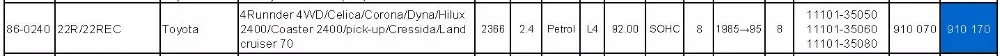 Применение:Для Toyota 4Runnder 4WD/Celica/Corona/Dyna/Hilux2400/Coaster2400/пикап/Cressida/Land Cruiser 70 2366cc 2.4L SOHC 8v 1985-95Двигатель:22R 22REC 2366cc 2.4L SOHC 8v 1985-95