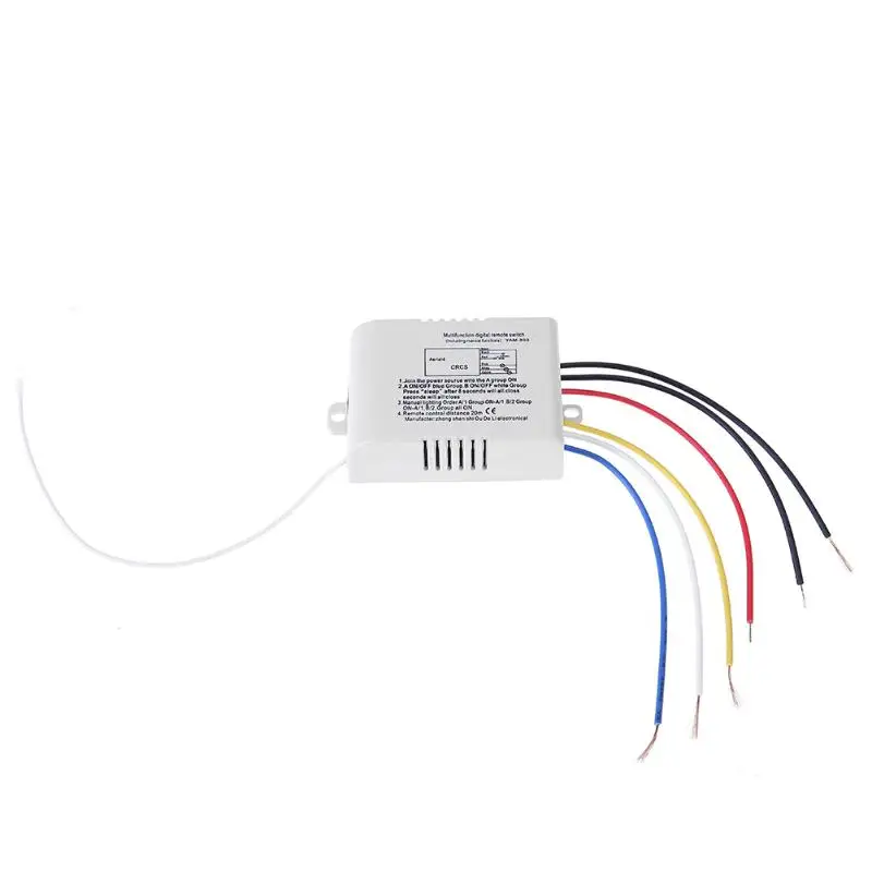 Быстрая установка, не блокируется стенками, может подключаться к любой нагрузке. Пульт дистанционного управления и переключатель можно использовать одновременно, удобно и гибко. Каждый пульт дистанционного управления имеет свой собственный специальный код. Больше комплектов можно использовать в одной комнате без помех. Три переключателя дистанционного управления: Функции: 1. После включения питания будет светильник A / 1. 2. A / 1 для включения/выключения синей группы, B / 2 для включения/выключения белой группы, C / 2 для включения/выключения желтой группы, «ВКЛ.»/«Выкл.» означает включение/выключение всего элемента. 3. Порядок ручного освещения (управление настенным переключателем): A / 1, B / 2, C / 3, вся цепь включается. Характеристики: Рабочее напряжение: 180 в-240 В переменного тока, 50 Гц/60 Гц Батарея дистанционного управления: 12В 23А батарея (за исключением батареи) Дистанция дистанционного управления: (в помещении) ≥ 20-30 метров Мощность нагрузки: 1 Вт Резистивная нагрузка: в пределах 1000 Вт Максимальная выходная мощность (например, лампы накаливания или светильник и т. д.)