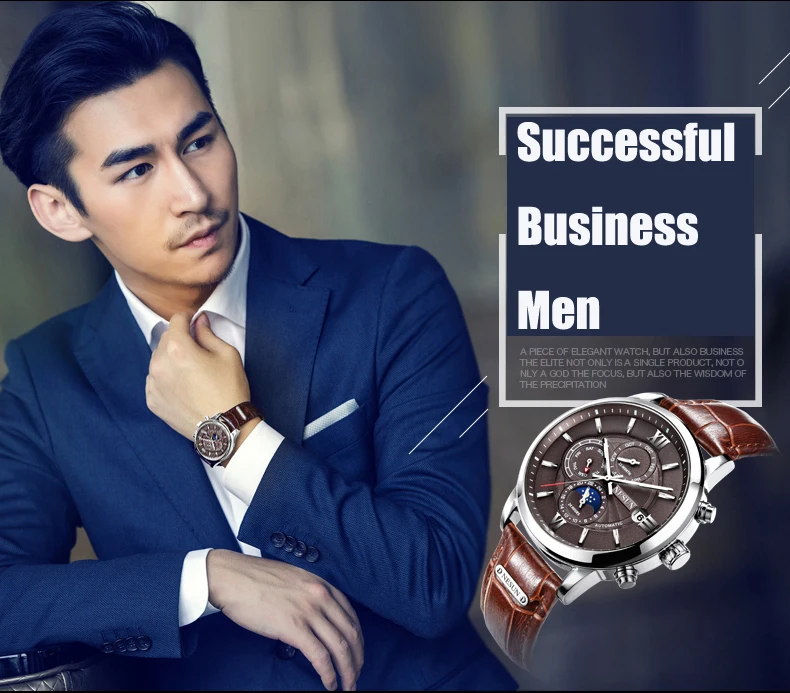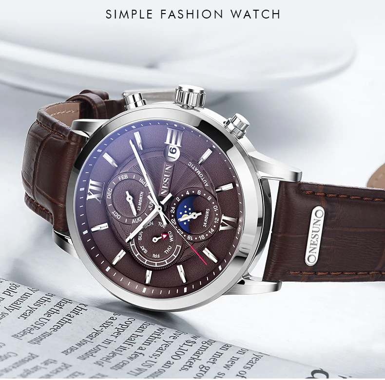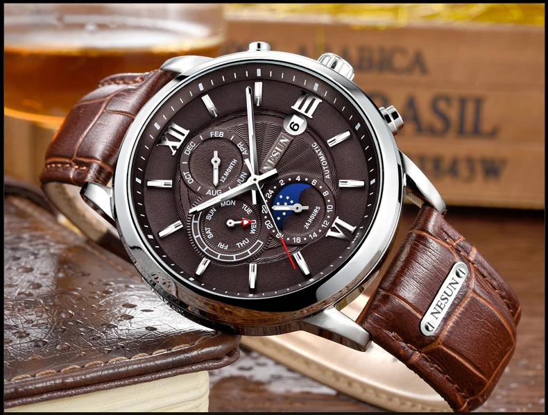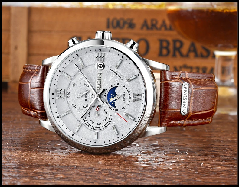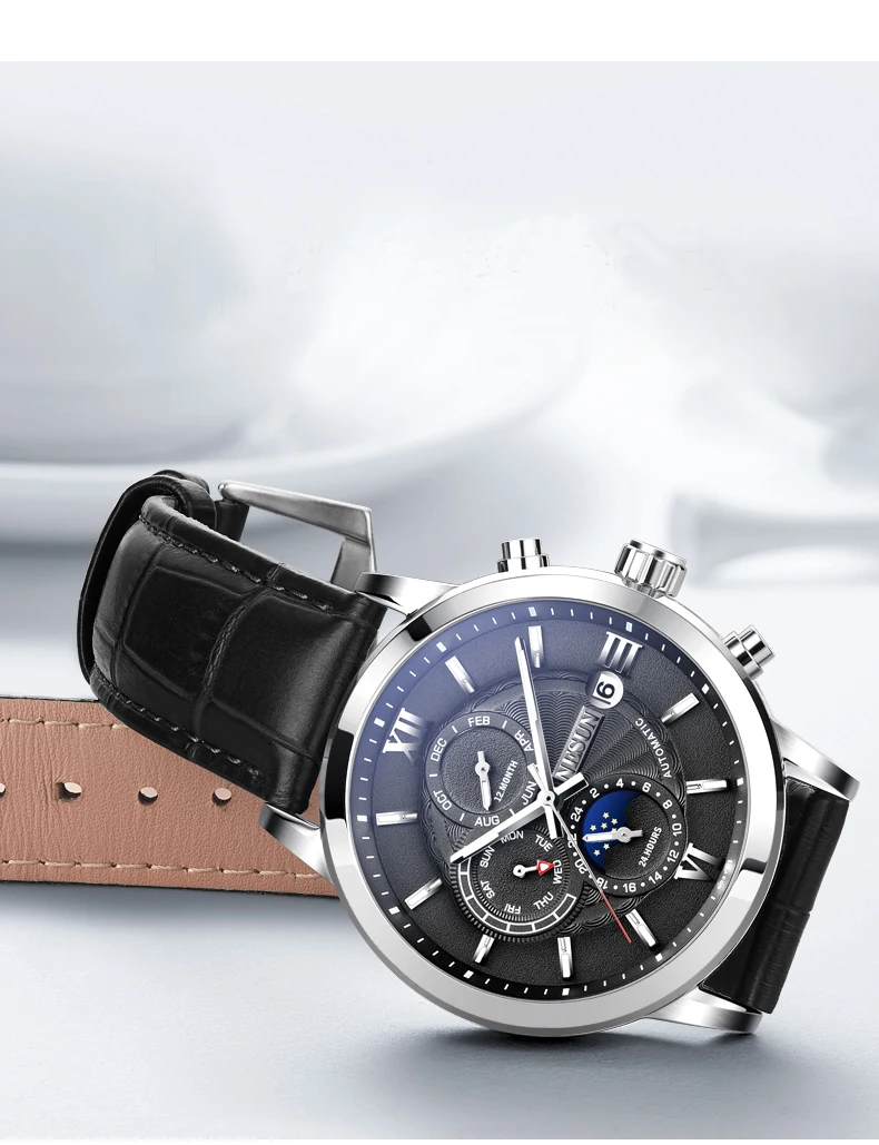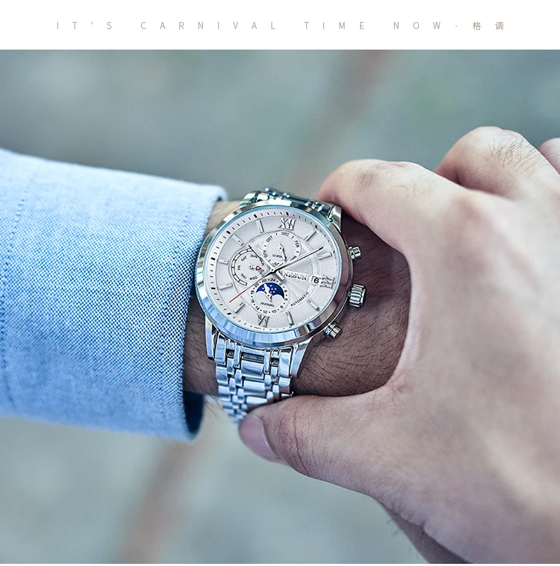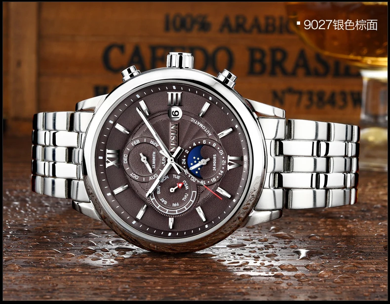 Характеристики: ремешок из нержавеющей стали, циферблаты «Луна» и «звезды», циферблат с циферблатом 24 часа и секунды, персонализированный циферблат с арабскими цифрами, светящиеся стрелки.