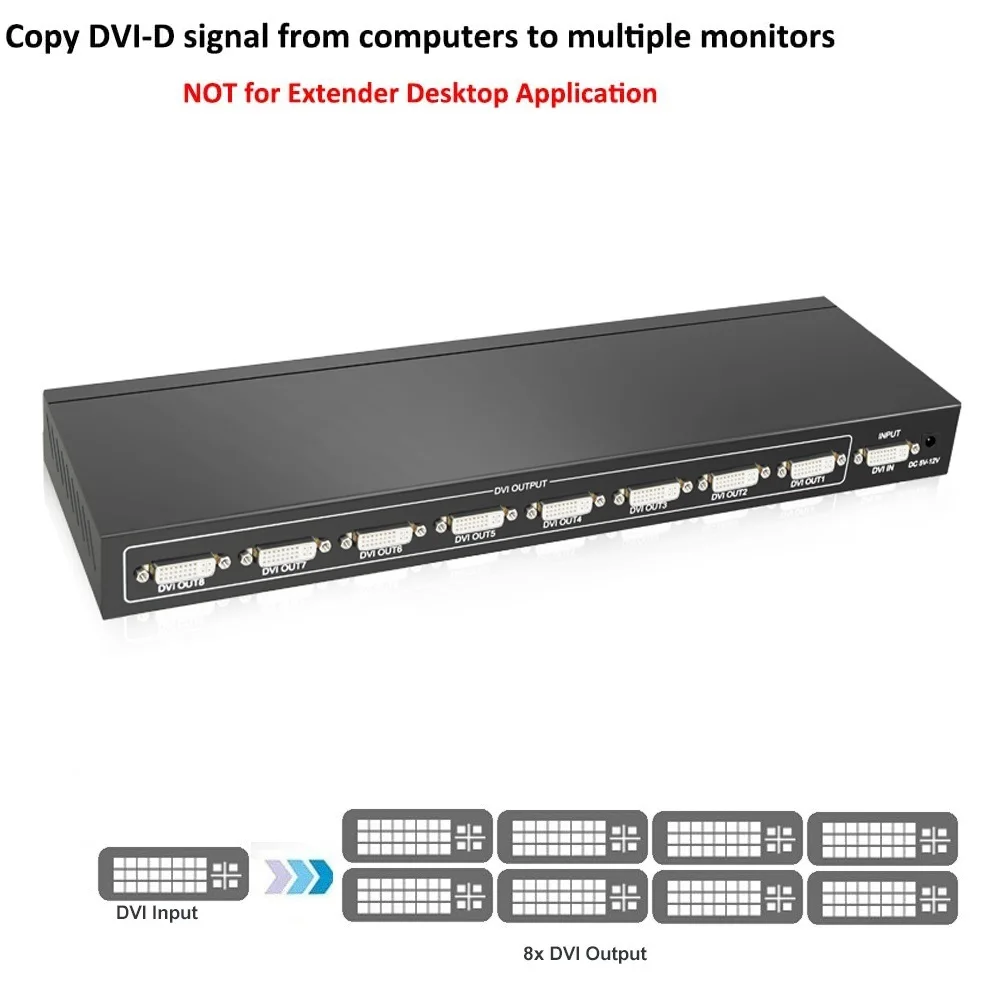 【DVI сплиттер 1 в 8 out】распределите DVI-D видеосигнала на восемь DVI-D мониторов, восемь мониторов отображают ту же картинку. Он не поддерживает отображение одного монитора в утонченном режиме рабочего стола и других мониторов в режиме расширения рабочего стола