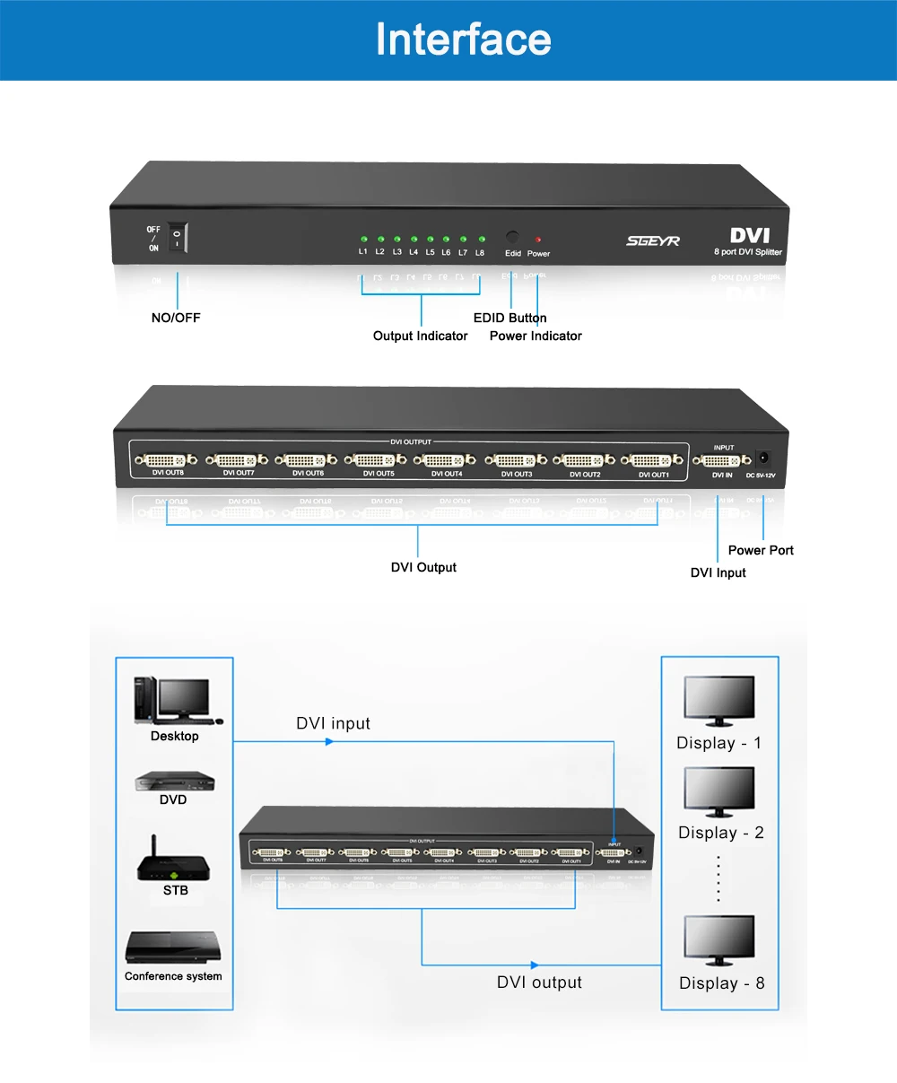 Сплиттер DVI 1x8,SGEYR 8 Порт DVI распределительный Дубликатор сплиттер 1 вход 8 выход Поддержка порта несколько видео дисплей 1920x1440