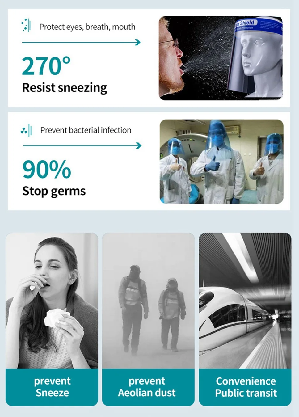 Особенности: 100% новый и высокое качество Он имеет регулируемую головную повязку и удобный откидной козырек Гибкая структура, удобная при ношении Портативный, легкий и прочный антикоррозийный Высокая защитная производительность, высокая термостойкость, стойкость к воздействию кислот и щелочей Идеально подходит для защиты от брызг масла при приготовлении пищи, пыленепроницаемый при очистке дома, шлифовке, горнодобывающей промышленности, лесозаготовке, химии
