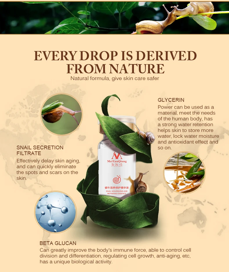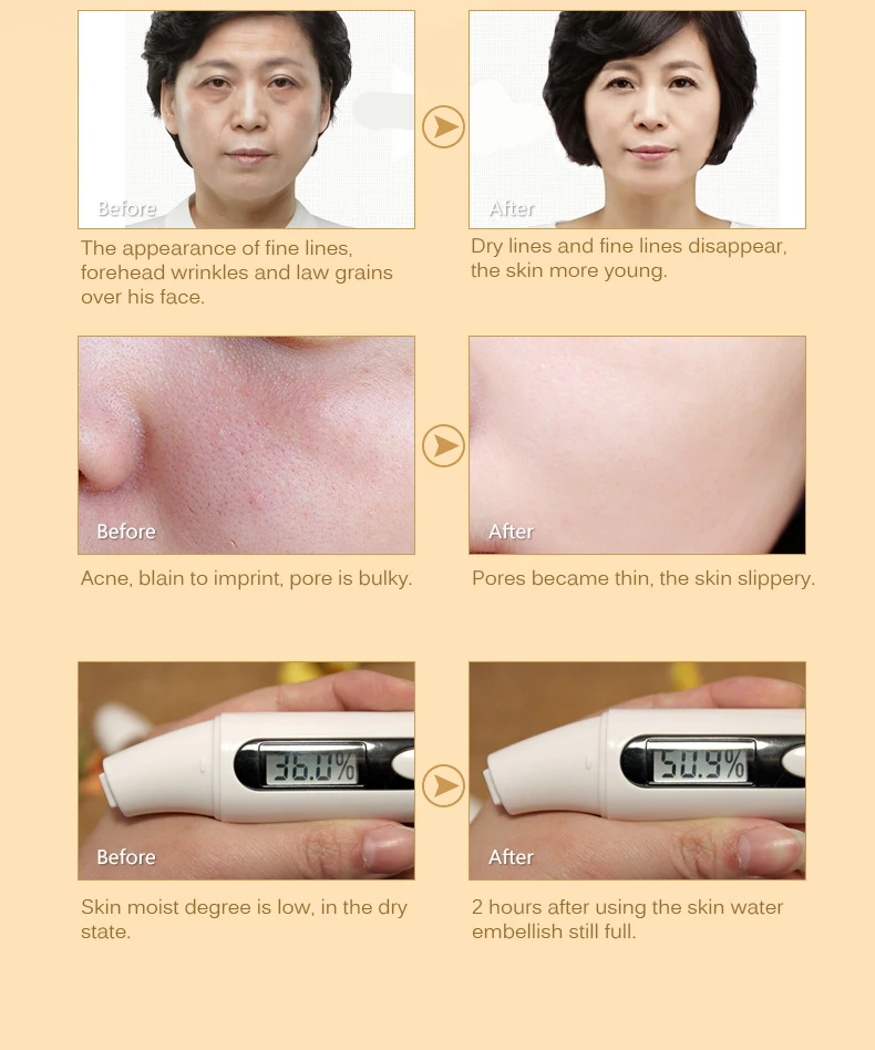 Содержит экстракт слизи улитки, текстура мягкой воды придает коже питание и влагу, помогает питать сухую кожу, улучшает сухость кожи и тонкие линии гладкие и изысканные, укрепляет кожу, сокращает поры, сделайте кожу нежной и эффектной, сделайте вашу кожу сияющей и полупрозрачной, чтобы избавиться от нее, блестящей.