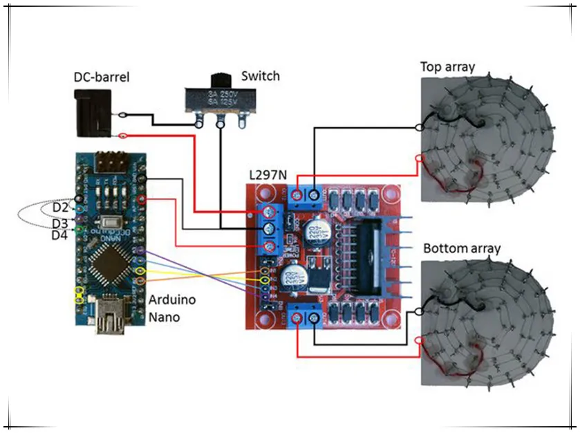 Акустическая Левитация-это интересная вещь: она использует тот факт, что звуковые волны переносят механическую энергию, чтобы наносить силу на объект. В этом чехол, эта сила направляется против гравитации, чтобы сделать объект левитируемым. Акустическая левитация, в отличие от магнитной левитации, может использоваться на широком спектре материалов (даже насекомых), хотя и является более слабой силой. Посылка список: 3D-printed TinyLev x1 Arduino Nano с кабелем mini USB x1 10 мм 40 кГц преобразователи x75 L298N плата привода с двойным двигателем x1 Адаптер питания постоянного тока 9 В x1 Мощность переключатель X1 Коннектором постоянного тока (5,5 X2.1mm) x1 Некоторые кабели перемычек Некоторые черные и красные провода Некоторые открытые провода