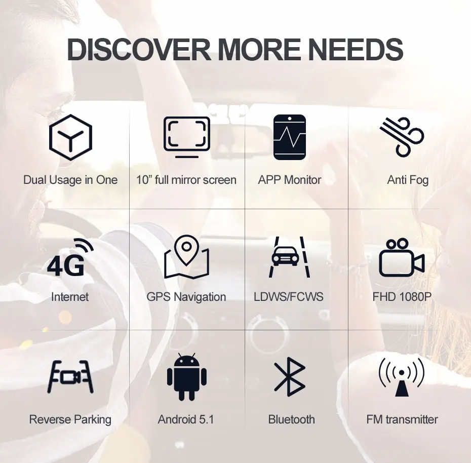 > WHEXUNE специальные android зеркало основные функции:> ADAS (LDWS/ FCWS/FVMA)+ 4G SIM & WIFI + gps-навигация + удаленный монитор в приложении «Car Assist»> WHEXUNE специальное android зеркало Другие функции:Full HD 1080P видео + гибкий Фронтальная камера + 10 дюймов полный Экран Дисплей + 1:1 Разделение вид Дисплей> Советы: устройство должно подключаться к оригинальному автомобильному зарядному устройству, будет работать хорошо, в противном случае экран будет мигать из-за нестабильного напряжения и тока. Мы предоставим вам кронштейн в соответствии с вашей моделью автомобиля, после оформления заказа, пожалуйста, оставьте нам информацию о вашем автомобиле в деталях, или мы отправим 1 # кронштейн случайным образом.