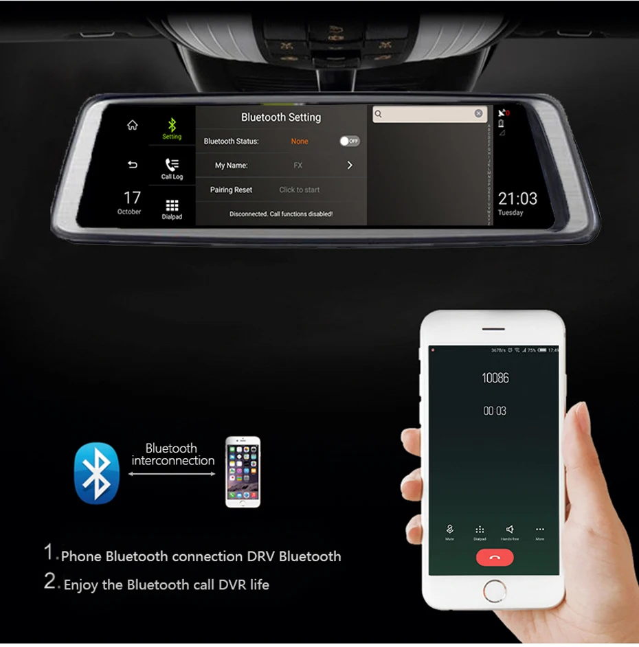 Bluetooth передача музыки и Bluetooth Handsfree ВызовОн встроен в модуль bluetooth, После сопряжения bluetooth с мобильный телефон, он может поддерживать телефонный звонок на автомобильном зеркале dvr, или передавать музыкальные песни на Автомобильный видеорегистратор с мобильного телефона.