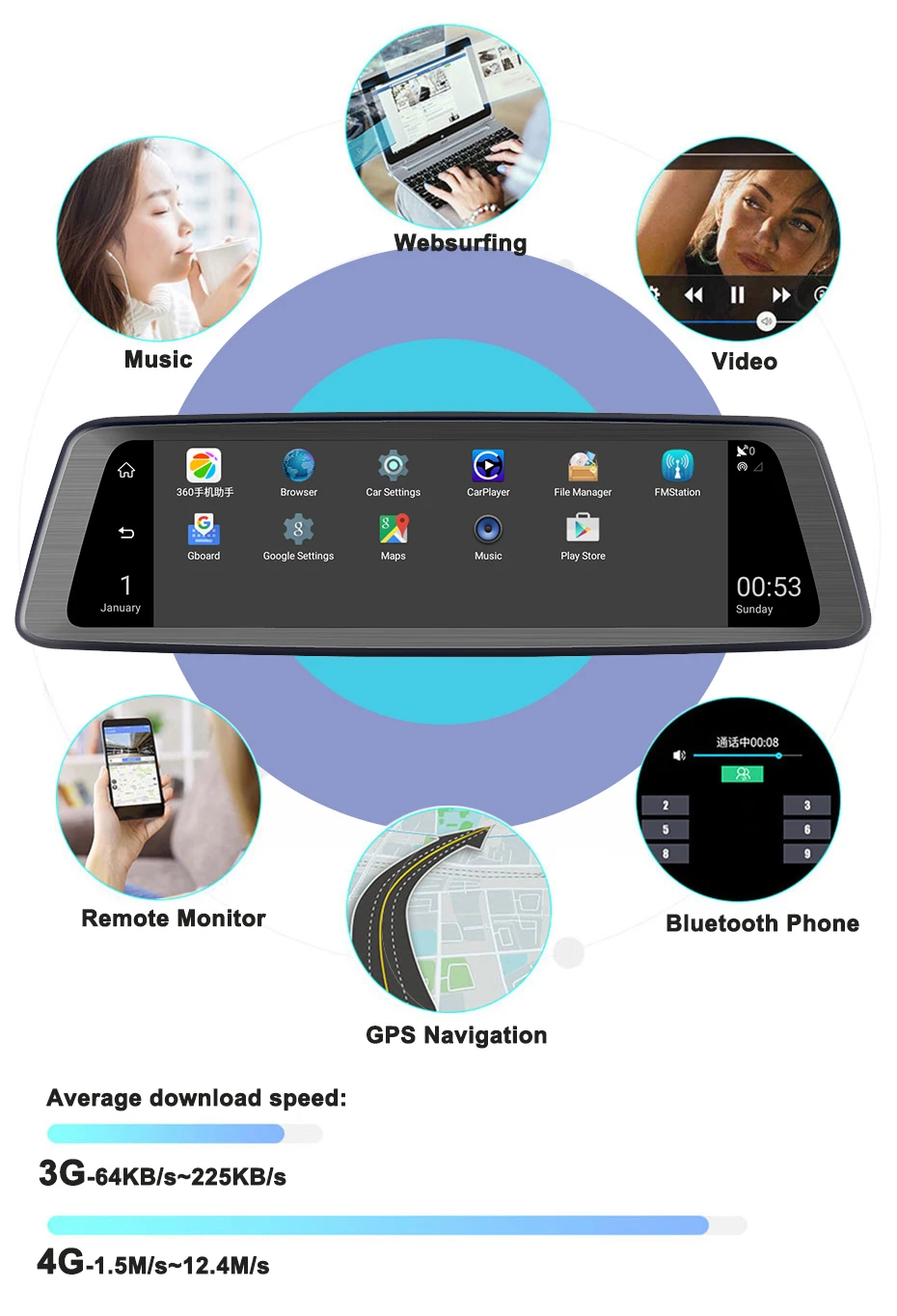 Загрузите ваш любимый GPS во внутреннюю память, с дополнительной GPS антенной, этот Видеорегистратор обеспечивает лучший опыт независимо от места назначения. Кроме того, это сетевая функция 3G/4G, помогает dvr быстрее и плавно получать онлайн gps-навигацию.