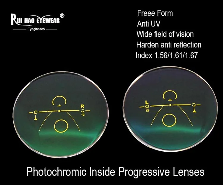 Наименование: внутри прогрессивные фотохромные линзы Бренд: RUI HAO EYEWEAR Количество: 1/пара (2 шт.) Пол: женщин, мужчин, Индекс: 1,56/1,61/1,67 Диаметр линз: 70 мм ~ 72 мм (различные предписания, диаметр будет отличаться)