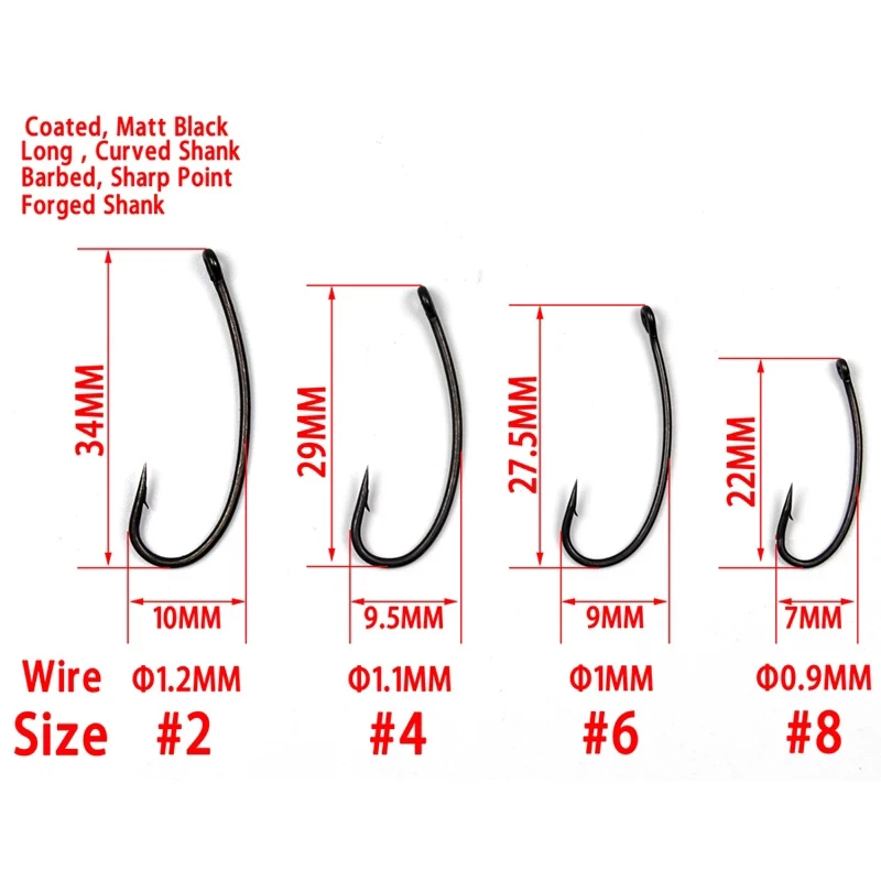 Длинные, изогнутые крючки с хвостовиком изготавливаются специально для включения в буровые установки, которые обеспечивают высокий уровень анти-Эжекции и в конечном итоге создают сильные крюки. С удлиненным изогнутым хвостовиком эти крючки механически скручиваются и поворачиваются чрезвычайно агрессивно при вдыхании или рту кормящим карпом.