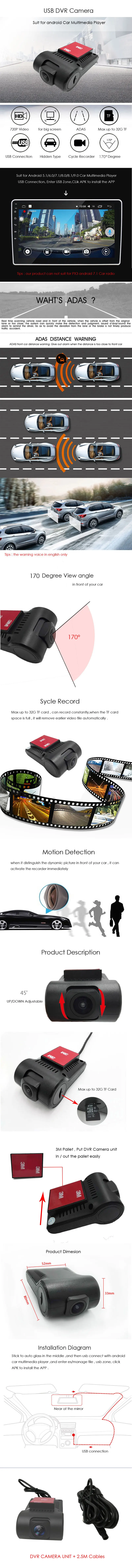 Внимание для покупателей из Германии Вы не можете выбрать доставку из Испании, пожалуйста, закажите товар из Китая, мы отправим вам товар непосредственно со склада ЕС 2,0 USB DVR камера для android автомобильный мультимедийный плеер, ADAS, циклическая запись, обнаружение движения, фото, подходит для большинства систем android Спецификация: Универсальная модель, подходит для всех автомобилей. Подходит для android 4,2, 4,4, 5,1, 6,0 7,1, 8,0, 8,1 9,0 Автомобильный мультимедийный плеер через USB соединение Предупреждение о расстоянии Adas Отображение даты/времени Функция циклической записи Обнаружение движения 3m наклейка на переднее Авто стекло USB кабель 2,5 м подключается к автомобильному мультимедийному устройству Android Слот для карты TF на видеорегистраторе, Максимальная память до 32G Свободно смотрите записанное видео на экране автомобильного мультимедийного плеера Свободно фотографировать в передней части вашего автомобиля Запись скорости вождения, функция доступна в Китае или некоторых странах Юго-Восточной Азии. Важное внимание: * Если ваше радио имеет wince system, пожалуйста, не покупайте, камера dvr не может поддерживать * Если ваше автомобильное радио PX3 android 7,1, пожалуйста, не покупайте, наш продукт не может работать FQA: * Как установить приложение на ваше автомобильное радио: Камера dvr подключается к радио, введите ES файл/менеджер-Откройте зону usb-есть программное обеспечение APK, нажмите его, чтобы установить приложение. * Как настроить функцию ADAS Вы делаете ваше автомобильное радио подключено к wifi, откройте приложение DVR, нажмите версию-Установите новую версию softare-введите настройки-Установите функцию ADAS. (Примечания: когда ваш автомобиль едет больше 65 км/ч, функция ADAS может работать)