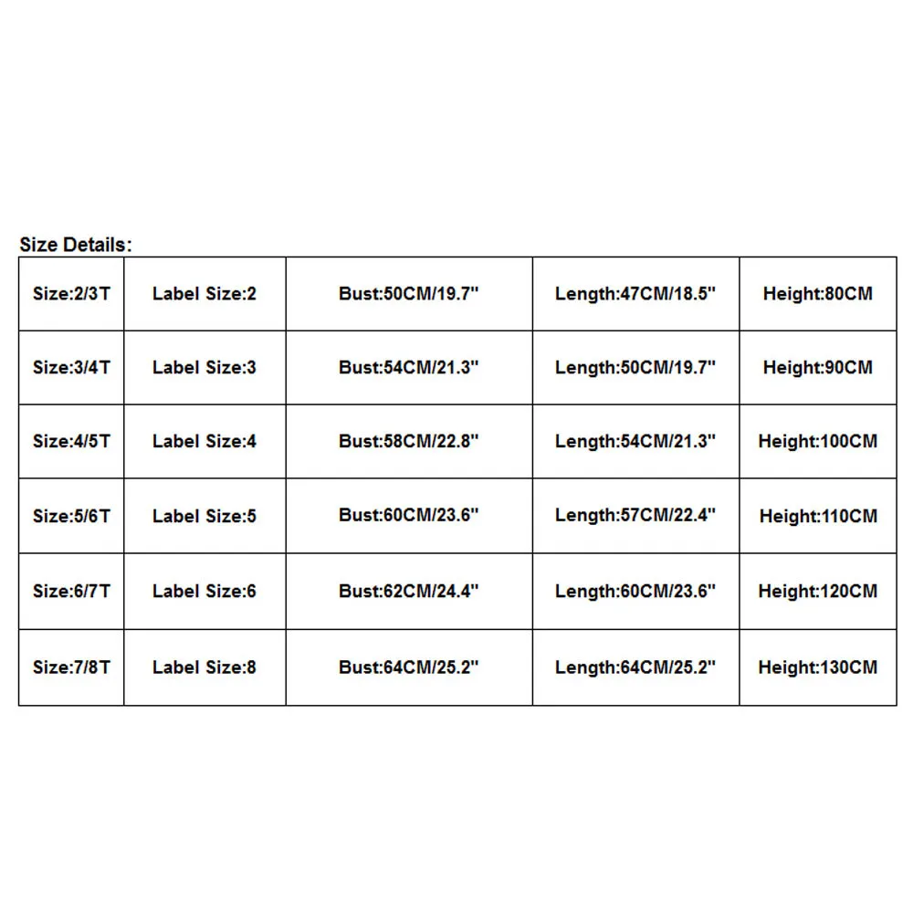 Размер: 2/3 T ЭтикеткаРазмер: 2 Бюст: 50См/19,7" Длина: 47См/18,5" Высота: 80 см Размер: 3/4 T ЭтикеткаРазмер: 3 Бюст: 54См/21,3" Длина: 50См/19,7" Высота: 90 см Размер: 4/5 T ЭтикеткаРазмер: 4 Бюст: 58См/22,8" Длина: 54См/21,3" Высота: 100 см Размер: 5/6 T ЭтикеткаРазмер: 5 Бюст:60См/23,6" Длина:57См/22,4" Высота: 110 см Размер: 6/7 T ЭтикеткаРазмер: 6 Бюст:62См/24,4" Длина: 60См/23,6" Высота: 120 см Размер: 7/8 T ЭтикеткаРазмер: 8 Бюст: 64См/25,2" Длина:64См/25,2" Высота: 130 см