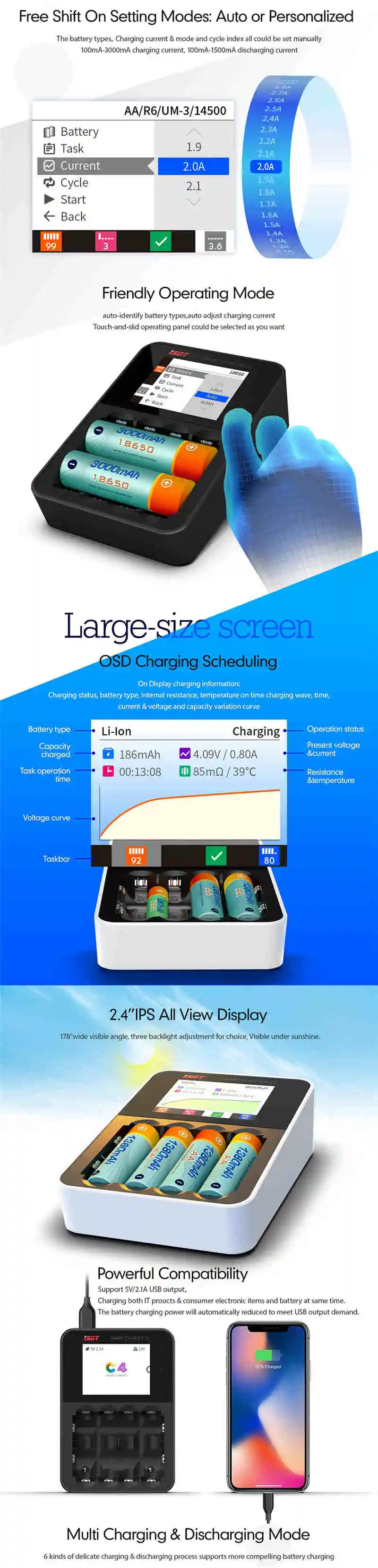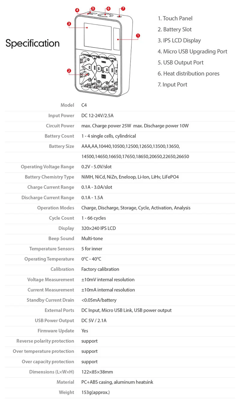 Описание: Входная мощность: 12-24 В/2,5 А постоянного тока Мощность цепи: Максимальная мощность зарядки 25 Вт Максимальная мощность разряда 10 Вт Количество батарей: 1-4 одиночных элемента, цилиндрический Размер батареи: AAA, AA, 10440, 10500, 12500, 13500, 13650, 14500, 14650, 16650, 17650, 18650, 20650, 22650, 26650 Диапазон рабочего напряжения: 0,2-5,0 В/слот Диапазон химии батареи: 0.1A-3.0A/слот Диапазон тока разряда: 0.1A-1.5A Режимы работы: зарядка, разрядка, хранение, цикл, активация, анализ Количество циклов: 1-66 циклов Дисплей: 320x240 IPS LCD Звуковой сигнал: мульти-тон Температурные датчики: 5 для внутренней поверхности Рабочая температура: 0 °C-40 °C Калибровка: Заводская калибровка Измерение напряжения: ± 10 мВ Внутреннее разрешение Измерение тока: ± 10 мВ Внутреннее разрешение Ток в режиме ожидания: 〈 0. 05ма/аккумулятор Внешние порты: вход постоянного тока, соединение Micro USB, выходная мощность USB Выходная мощность USB: 5 В/2,1 а постоянного тока Обновление прошивки: Да Защита от обратной полярности: Поддержка Защита от перегрева: Поддержка Защита от перегрузки: Поддержка Размеры (ДхШхВ): 122x85x38мм Материал: PC + ABS корпус, алюминиевый радиатор Вес: 153 г (прибл.)