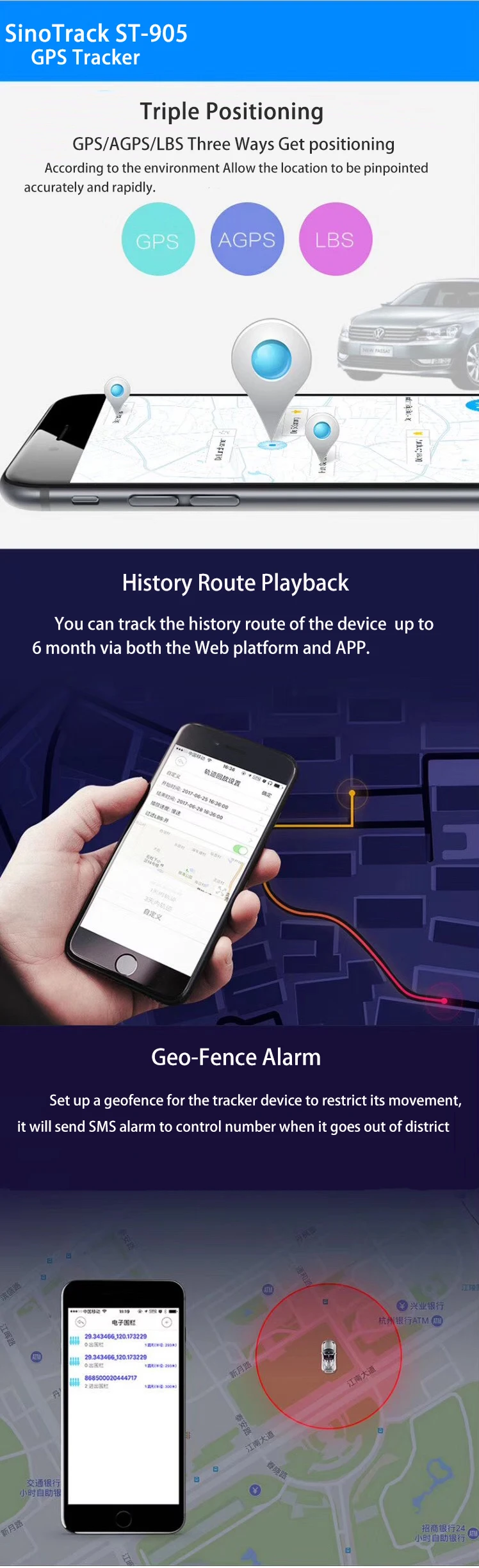 Аккумулятор 5000 мАч 1. Режим работы: (3 дня) (Трекер будет продолжать работать и отправлять данные по временному интервалу) 2. Перемещение-работа, когда трекер движется: (15 дней) (Заводская Настройка-режим «MOVE») (Трекер работает только при движении, когда он остановлен, он будет Сон, отключение GPS, GSM работает в режиме низкого потребления. Вибрация, SMS команда, трекер вызова может просыпаться трекер Для работы 5 минут.) 3. STANDBY-SMS или вызов в трекер, он будет работать 5 минут (60 дней) (Режим ожидания, отключение GPS, GSM работает при низком потреблении. SMS, вызов может разбудить трекер до работы 5 минут.) * Пожалуйста, используйте микро-sim-карту для отслеживания. * Пожалуйста, правильно вставьте sim-карту GSM в устройство. * Пожалуйста, убедитесь, что sim-карта GSM имеет достаточный баланс. * Только GSM sim-карта работает в этой модели, если вы используете карту 3G или 4G, Пожалуйста, подтвердите, что он должен иметь функцию GSM. * Пожалуйста, убедитесь, что sim-карта GSM поддерживает звонки, Отправка сообщений, сеть GPRS. * Пожалуйста, убедитесь, что GSM карта открыла дисплей ID вызова Функция и отключение передачи вызова.