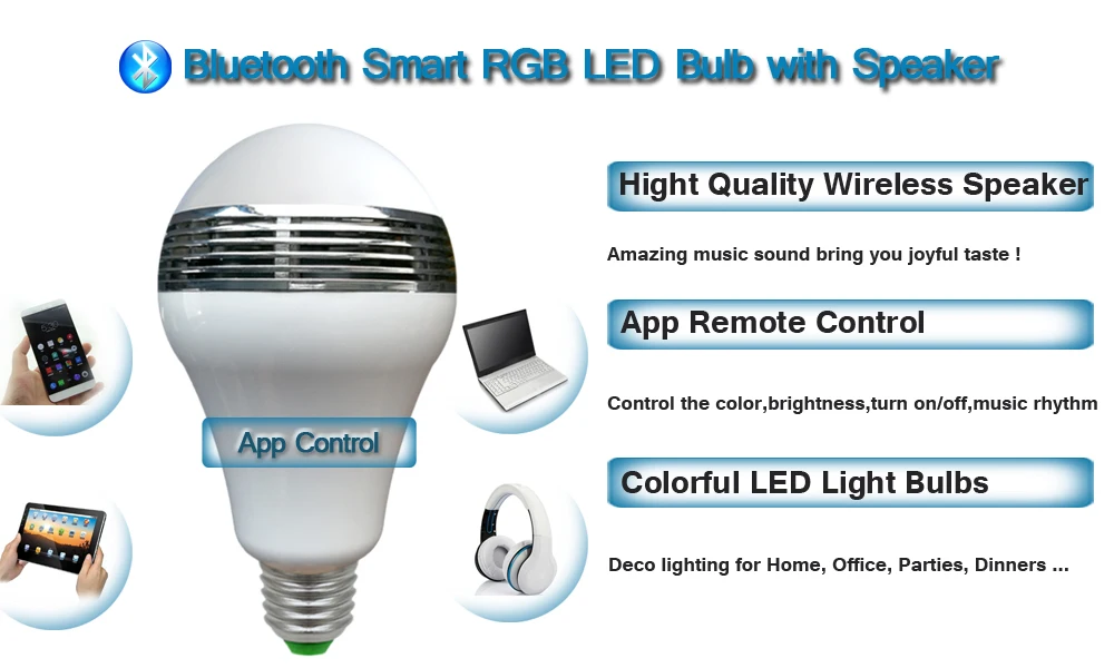 Этот Bluetooth музыкальный динамик лампа может позволить вам наслаждаться расслабляющей и комфортной жизнью. С резьбовым интерфейсом, он имеет отличную совместимость и легко винт. Переносите музыку на лампочку с помощью смарт-устройства Bluetooth. Более того, Управление приложением bluetooth может достигать расстояния 10 м, Легко регулируемая яркость, так что он идеально подходит для вас, чтобы сидеть на кровати или диване и слушать музыку светодио дный время СВЕТОДИОД светит. Это абсолютно заставляет вас расслабиться и достаточно забавных вещей! Особенности: 1. модные товары с уникальным дизайном, который вместе с RGB светодио дный, инфракрасным, Bluetooth и Стерео Аудио комбинированный продукт; 2. APP control-приложение может управлять музыкой, регулировать яркость и выбирать цвета. Bluetooth 4,0: уникальная скорость передачи; 3. расстояние инфракрасного излучения> 12 м прямое расстояние и без препятствий Управление громкостью через смартфон (Iphone, Ipod, Ipad, samsung Galaxy, Androids & more); 4. держатель лампы E27-отличная совместимость и низкое потребление энергии и ярче Различные виды сцен применения -- такие как спальня, кухня, ванная комната, проход, кабинет, салон и т. д. 5. аудиоприемник Bluetooth подходит для всех видов товары с Bluetooth, таких как мобильный телефон, MID, tabletPC и т. д. 6. светодио дный кольцом полоса люминесценции снаружи и мощных динамиков insideEnergy экономии, RGB затемнения и стробоскопический глаз-защита светодио дный лампа Упрощенная Настройка, простое подключение и полный контроль с помощью приложения. Посылка